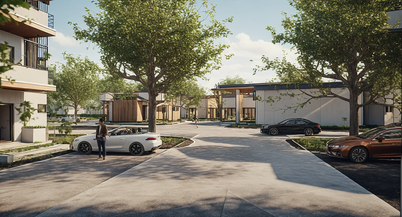 PromptA mass housing development complex, including people and vehicles depicting life, and the far ground is a convenience centre?