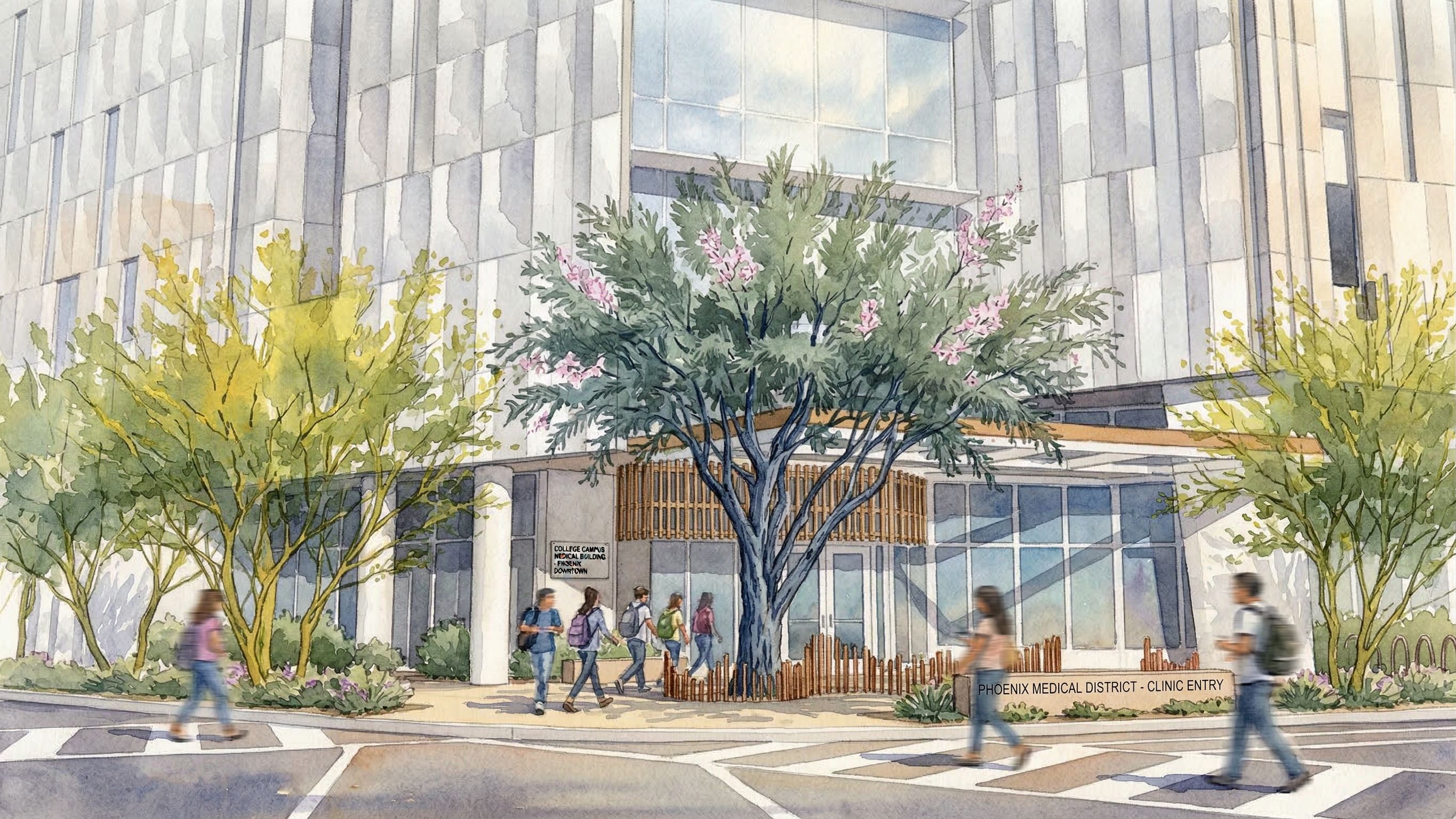 Promptuse the sketchup model to accurately render a loose watercolor with people for a college campus medical building entry in phoenix downtown. render the pink tree as a desert ironwood with blue grey bark and a few light pink blooms , keep exact camera angle