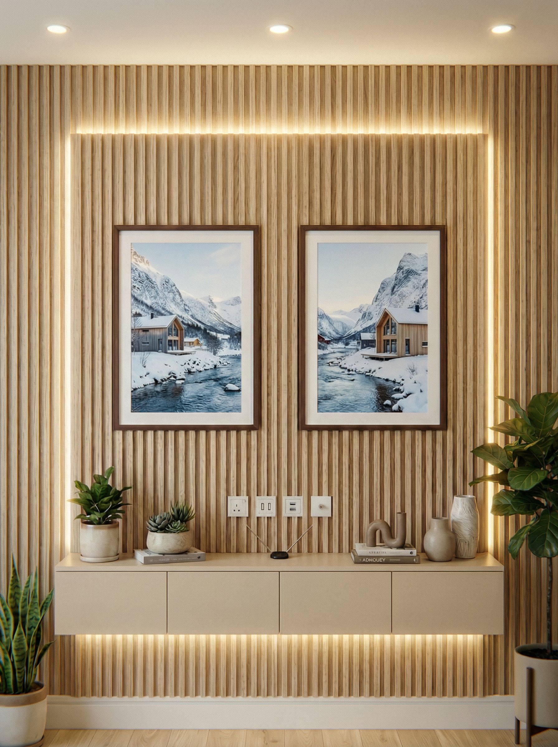 Promptcubre toda la pared completa hasta la parte de arriba de los zócalos con el panel de madera de la imagen de referencia, keep exact camera angle