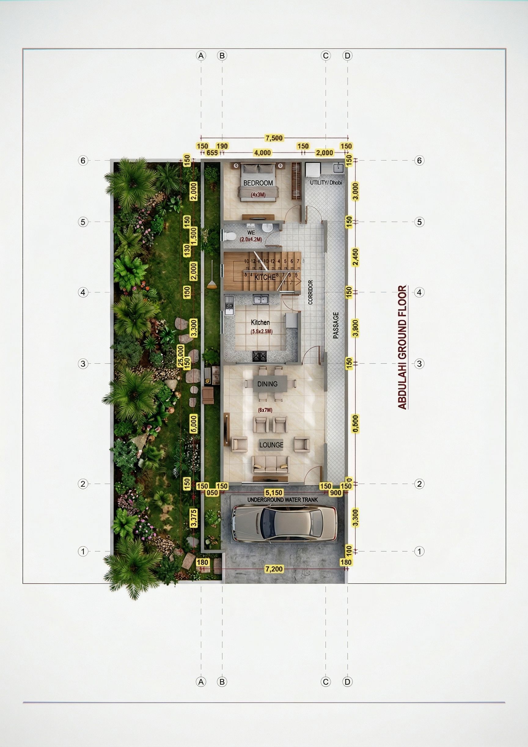 PLAN OF A HOUSE WITH CLEAR PARTITIONS. USE CERAMIC FLOOR TILES ON THE FLOOR. SOME GARDENING ALONG THE LEFT SIDE IN GREEN COLOUR. MAKE LAYOUT REALISTIC AND HIGH RESOLUTION 8K. KEEP ORIGINAL ANNOTATION. INCLUDE STAIRCASE AS IN ORIGINAL PLAN AND STORE UNDER STAIRCASE. MAINTAIN ORIGINAL LAYOUT BUT MAKE PARTITIONS CLEAR AND IMAGE HIGH RESOLUTION 8K. MAINTAIN ORIGINAL ANNOTATION., keep exact camera angle
