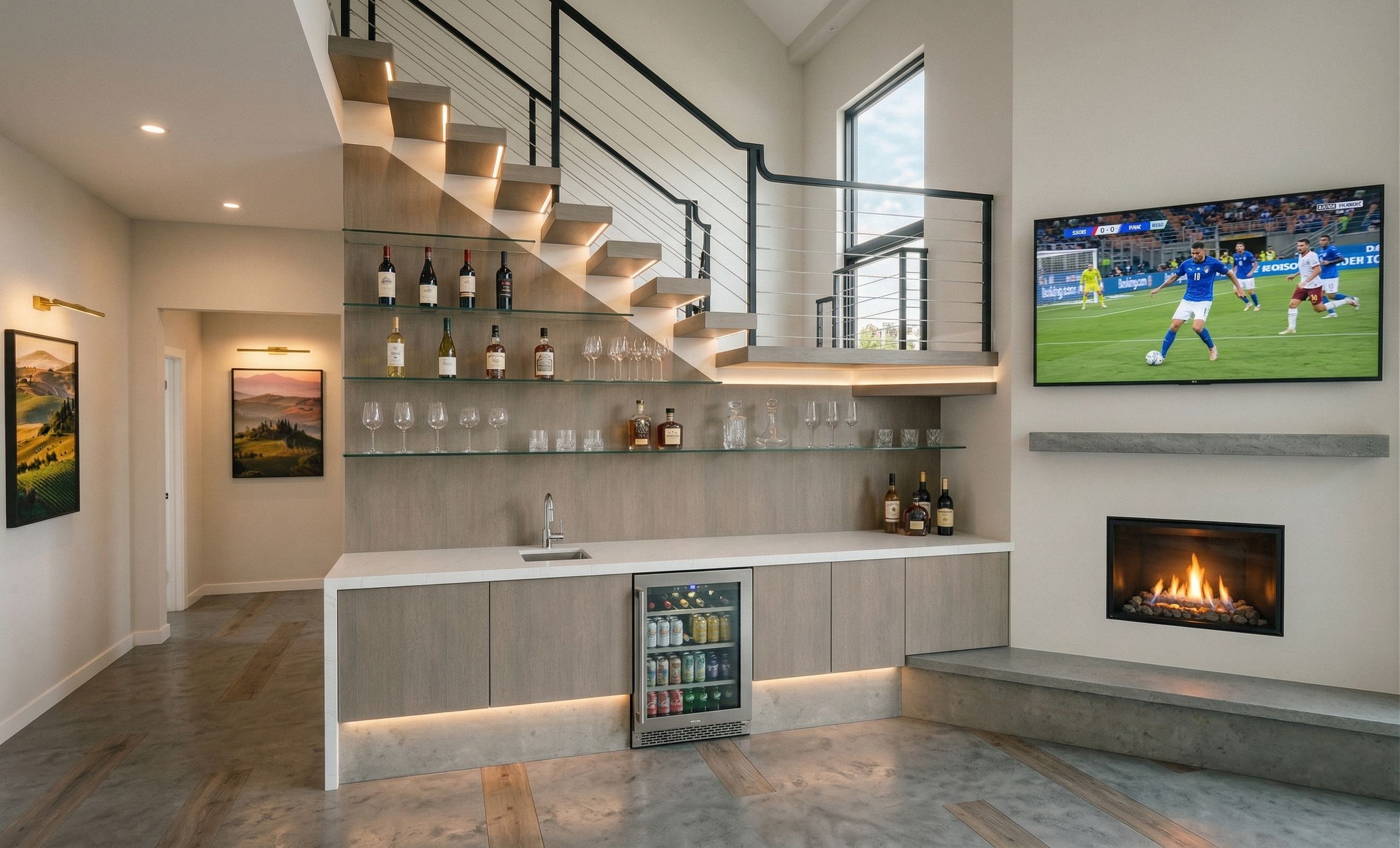 make photorealistic rendering from this image make wet bar under the stairs next to fireplace as indicated wood is light to medium gray alder design it so the fireplace and wet bar are connected Wet bar has glass shelves beverages are combination of nonalcoholic and wine more glassware than bottles fireplace is direct vent gas fireplace, show fireplace on burning, fireplace wall is drywall railing is black steel TV above the fireplace is showing soccer field with Italian soccer team playing do not add any furnishings outside of wet bar area lights on in the room add lighting under the stair steps skies trough the existing stair window do not add windows do not add windows do not add windows keep existing windows do not add doors keep existing doors, keep exact camera angle