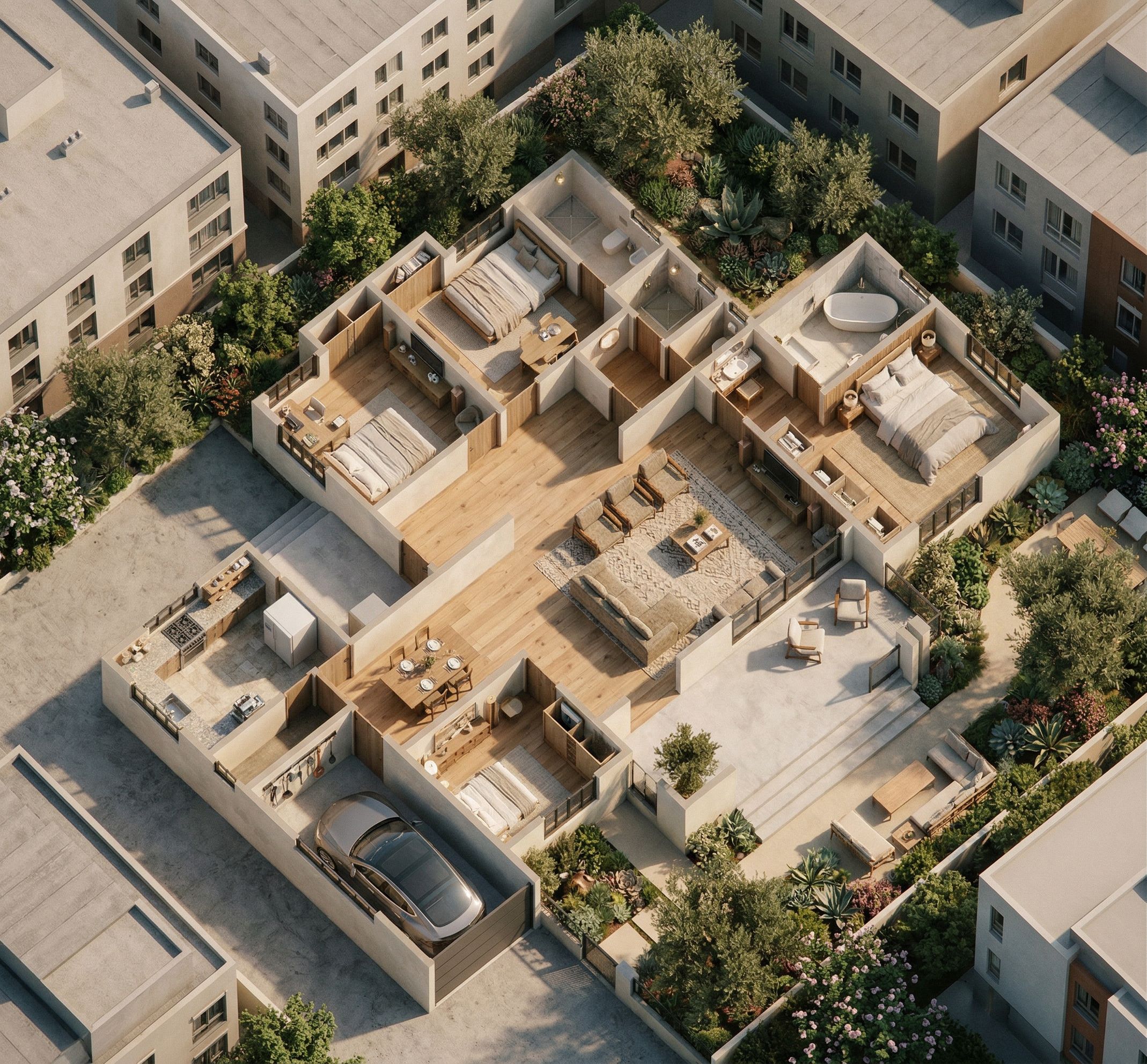 Photo of a modern residential floor plan, focusing on intricate design elements like spacious rooms, open-concept living areas, and contemporary finishes. Highlight textures of flooring, walls, and furnishings with attention to details in kitchen and bathroom layouts. Surrounded by urban landscaping and neighboring buildings. Natural daylight pours in, casting soft shadows and enhancing the ambiance. Captured from an elevated angle using a wide-angle lens to emphasize spatial relationships and flow between areas., keep exact camera angle