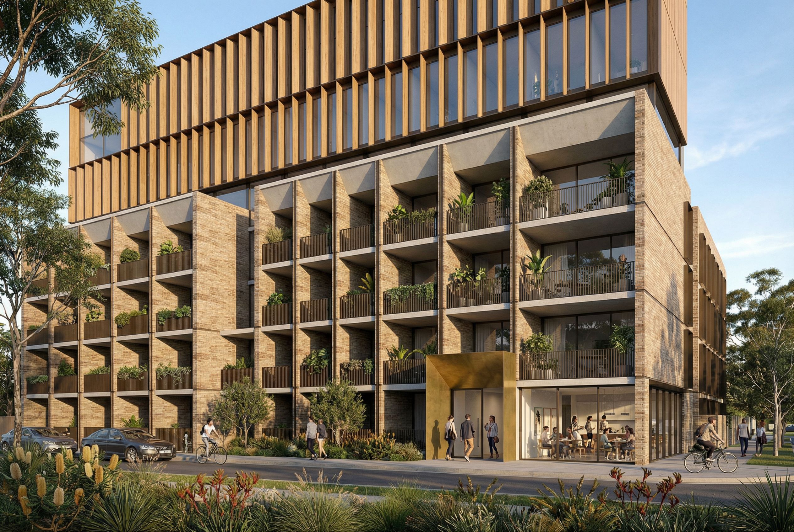 architectural exterior rendering, render this 3D mass into photorealistic rendering, architectural exterior rendering, render this 3D mass into photorealistic rendering, Do not change the 3D massing image provided. The building is located at 16-24 school parade, Marrickville NSW. Use brick as per reference image. The horizontal slabs shown as light gray in the image to be concrete. Metal trim is brass and dark bronze as indicated. The vertical walls within the grid have brick edges. There is a 3m front setback and 3m side setbacks, include australian natuve landscaping in the 3m front setback. Include some street trees. At ground floor there is the building entry with a brass shroud and to the right of this is communal living space with glazing, populate the communal living space with people and show several people entering the building. Include several pot plants on the balconies behind the balustrades. The facade is facing East, include low morning light hitting the facade., eye level view, bright daylight, natural lighting, including people, vehicles, greenery and vegetation, trees, high quality, professional, detailed scene