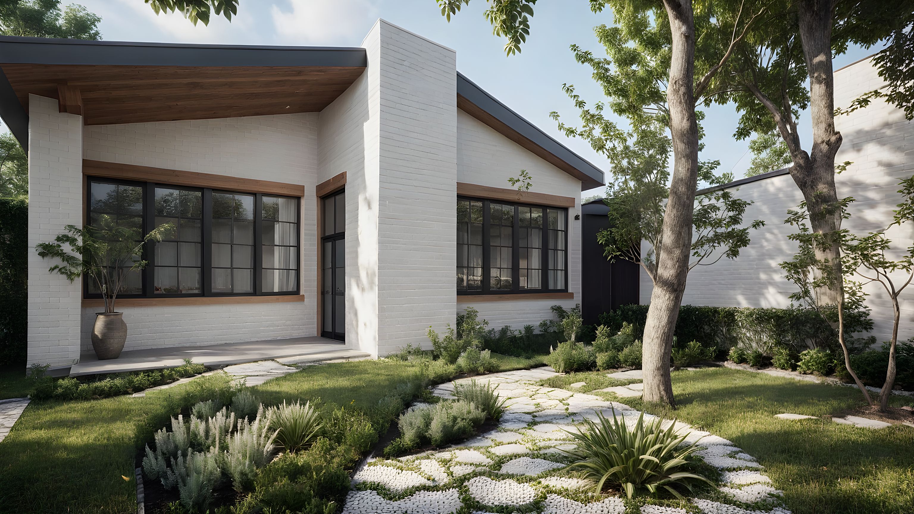 Promptthis is the facade of a medical office and architecture studio. the facade is made of exposed white bricks, the house is old, warm, and has a beautiful and lovely garden.