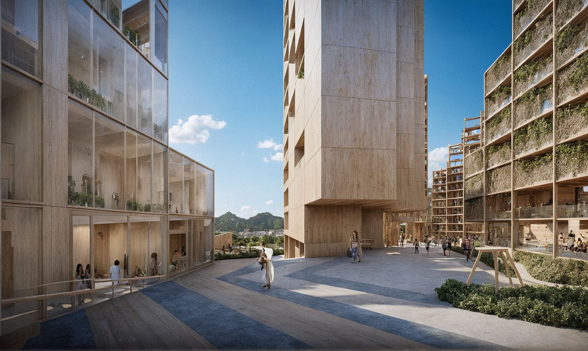 PromptA modular residential complex organized around a large central courtyard. The architecture is defined by a structural grid of exposed timber beams and columns, with transparent glass walls and open balconies. Multiple levels of walkways, terraces, and staircases create visual permeability and social interaction. The courtyard is filled with greenery, communal furniture, and people gathering, working, and socializing, evoking a sense of community and openness. The design emphasizes sustainable materials, biophilic principles, and human-centered living. Photorealistic render, natural daylight, high detail, architectural visualization style.