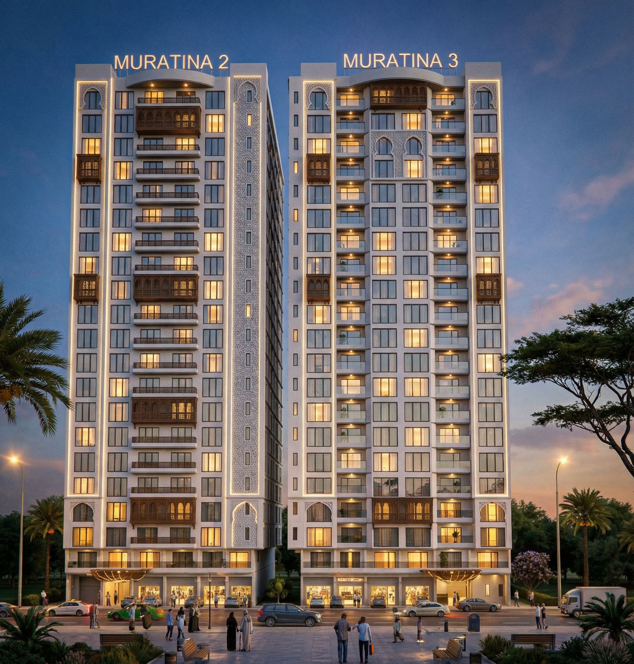 PromptImage of a building with ground floor and first floors as commercial and other floors apartments. Turn on the lights in the building. Make glass reflective, clear and realistic. Include mouldings in openings and windows. Use white wall master on the building. Include people of somali and african origin infront of the building. Put rope lights, spot lights and street lihhts in the image. Give the building an arabic character., keep exact camera angle
