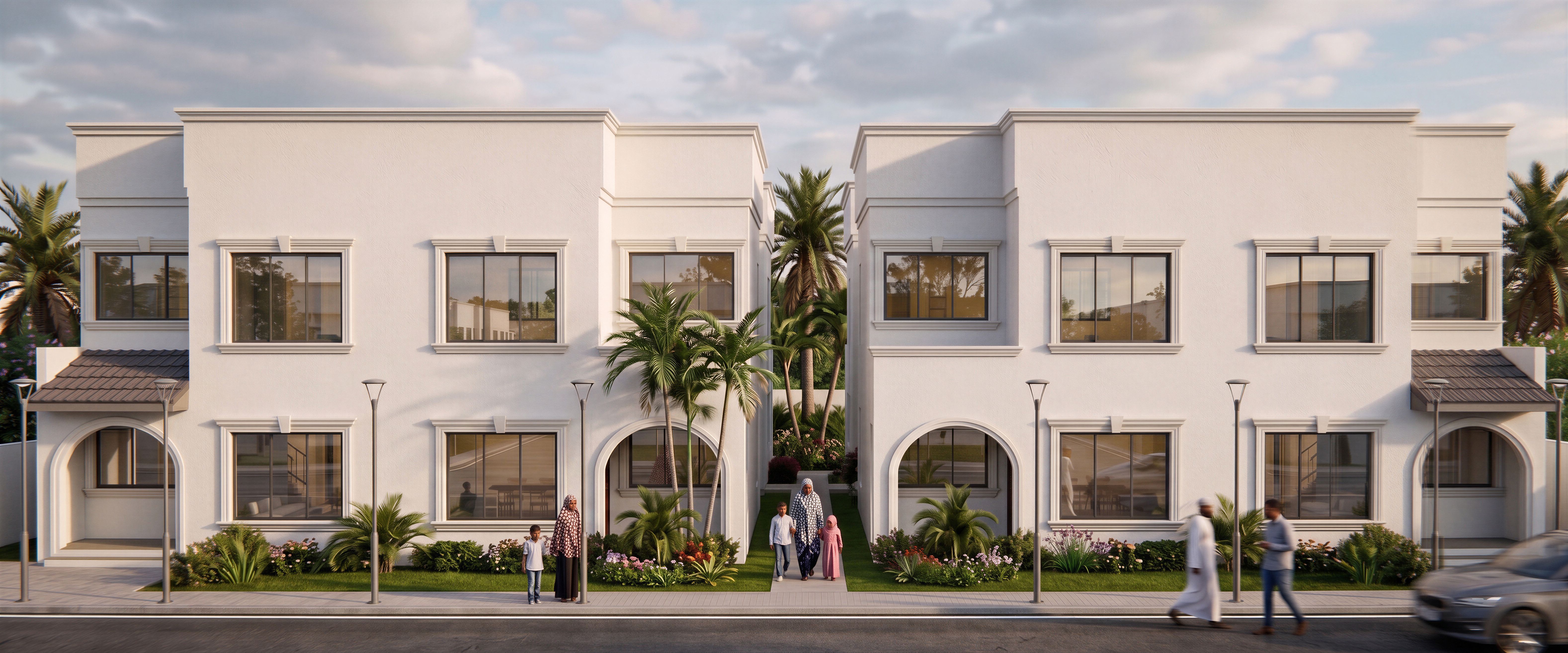 IMAGE OF UNITS WITH A MIDDLE GREEN COURT WITH LANDSCAPING. USE MOULDINGS AROUND OPENINGS AND WINDOWS. MAKE GLASS REFLECTIVE AND REALISTIC. INCLUDE PEOPLE AND CHILDREN OF SOMALI ORIGIN IN THE IMAGE. USE WHITE WALL MASTER ON THE BUILDING. INCLUDE SOME STREET LIGHTS. USE PALM TREES IN THE DESIGN. MAKE IMAGE HIGH RESOLUTION 8K. MAKE IMAGE REALISTIC AND 8K. REMOVE THE CROSS ON THE BUILDING. MAINATIN ORIGINAL UPLOADED DESIGN AND USE REFERENCE FILE FOR MATERIALS ONLY., keep exact camera angle