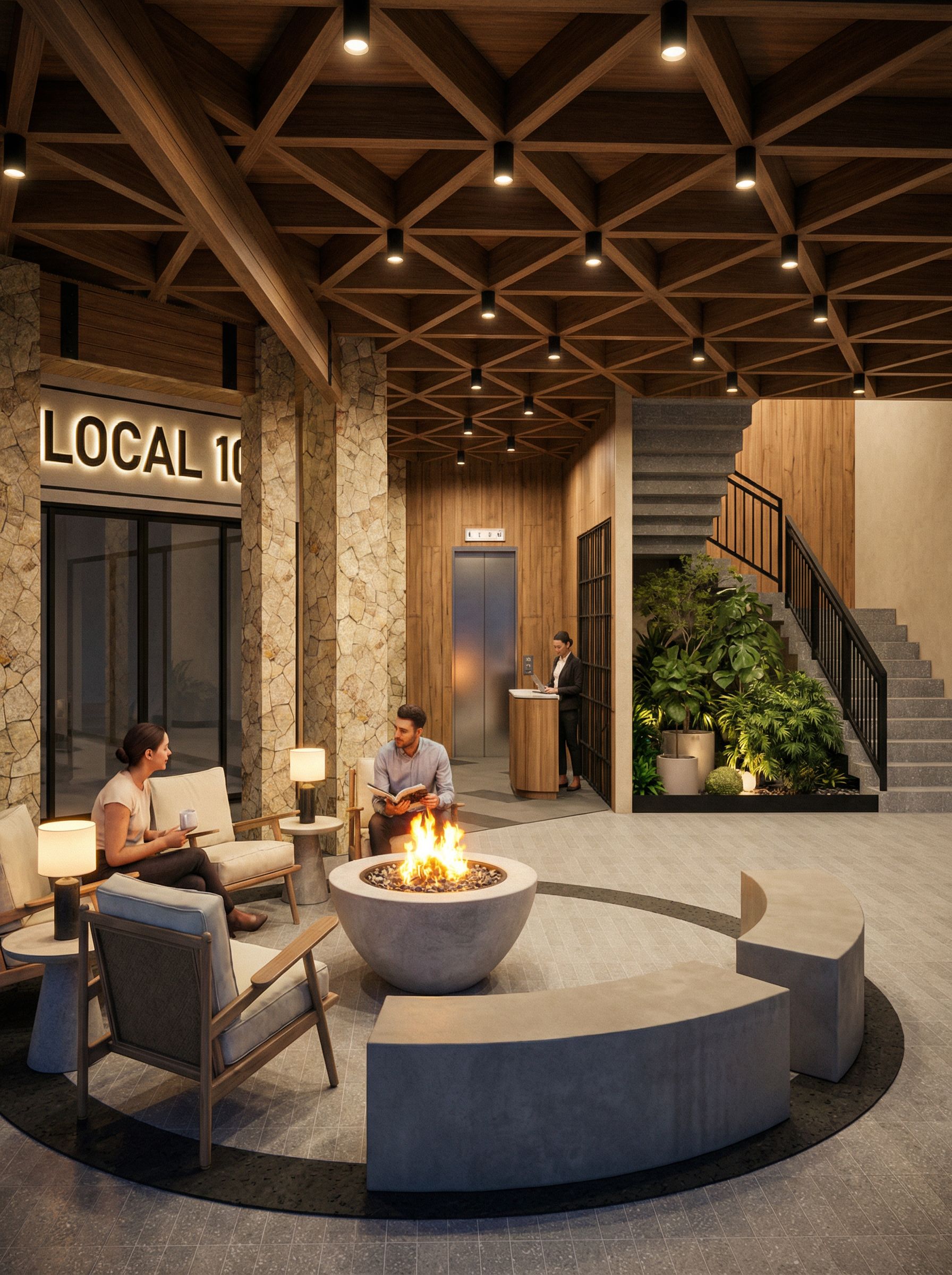 PromptHigh-end photorealistic boutique hotel motor lobby, warm and sophisticated arrival experience. Gray 7x30 cm tile floor and granite-style stairs, natural matte walnut wood ceiling in grid layout with 10 cm black tubular lights at intersections, soft warm hospitality lighting. Local San Cristóbal flagstone columns, matte black metal railings and hardware. Aged concrete plants for modern square, curated green area beside stairs. Low-profile aged concrete fire pit with subtle glow. Natural matte walnut wood wall paneling. Cinematic lighting, global illumination, realistic materials, soft shadows, ambient occlusion, wide-angle architectural lens, eye-level, ultra-high resolution , keep exact camera angle
