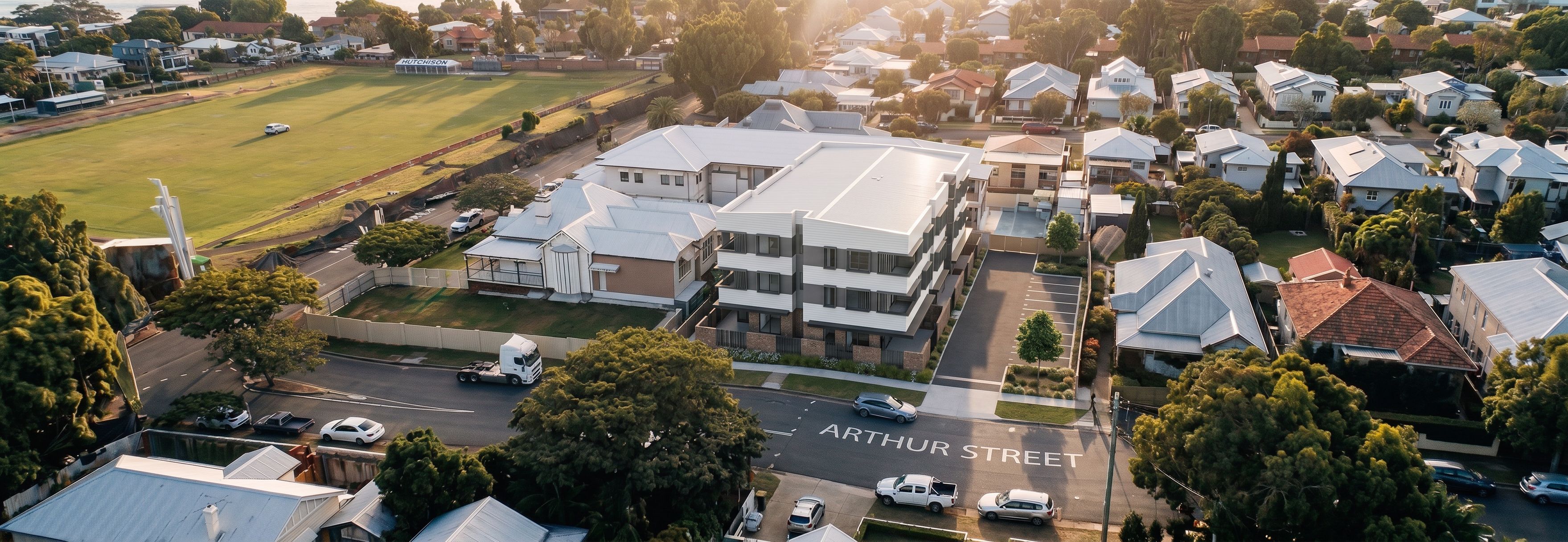 PromptUse “Render slab pouring.png” as the base image and keep the exact same camera angle, composition, and perspective (elevated wide‑angle view). Do not change the surrounding neighbourhood, trees, sports field, street, fencing, or any existing buildings except the active work zone where the slab is being poured. Preserve exactly as-is: the existing multi‑storey building at the rear (outside works) and the heritage-listed home on the left—same form, colours, and placement as in the base image. Replace only the slab‑pour area with the new building massing from “014_Scenario 1_CONSTRUCTION PHASE_Default Slide 1”, positioned exactly where the slab pour was. Render the new building façade to match the colours, materials, and style shown in “new building refernce image.png” (same façade language and palette). Remove all construction pour equipment and vehicles: no concrete trucks, no concrete pump, no crane. Add the new carpark layout with linemarking exactly as indicated in “014_Scenario 1_CONSTRUCTION PHASE_Default Slide 1”. Keep an urban residential setting with nearby houses and a sports field in the background, surrounded by trees. Render with natural late‑afternoon light and soft shadows, photo‑realistic., keep exact camera angle