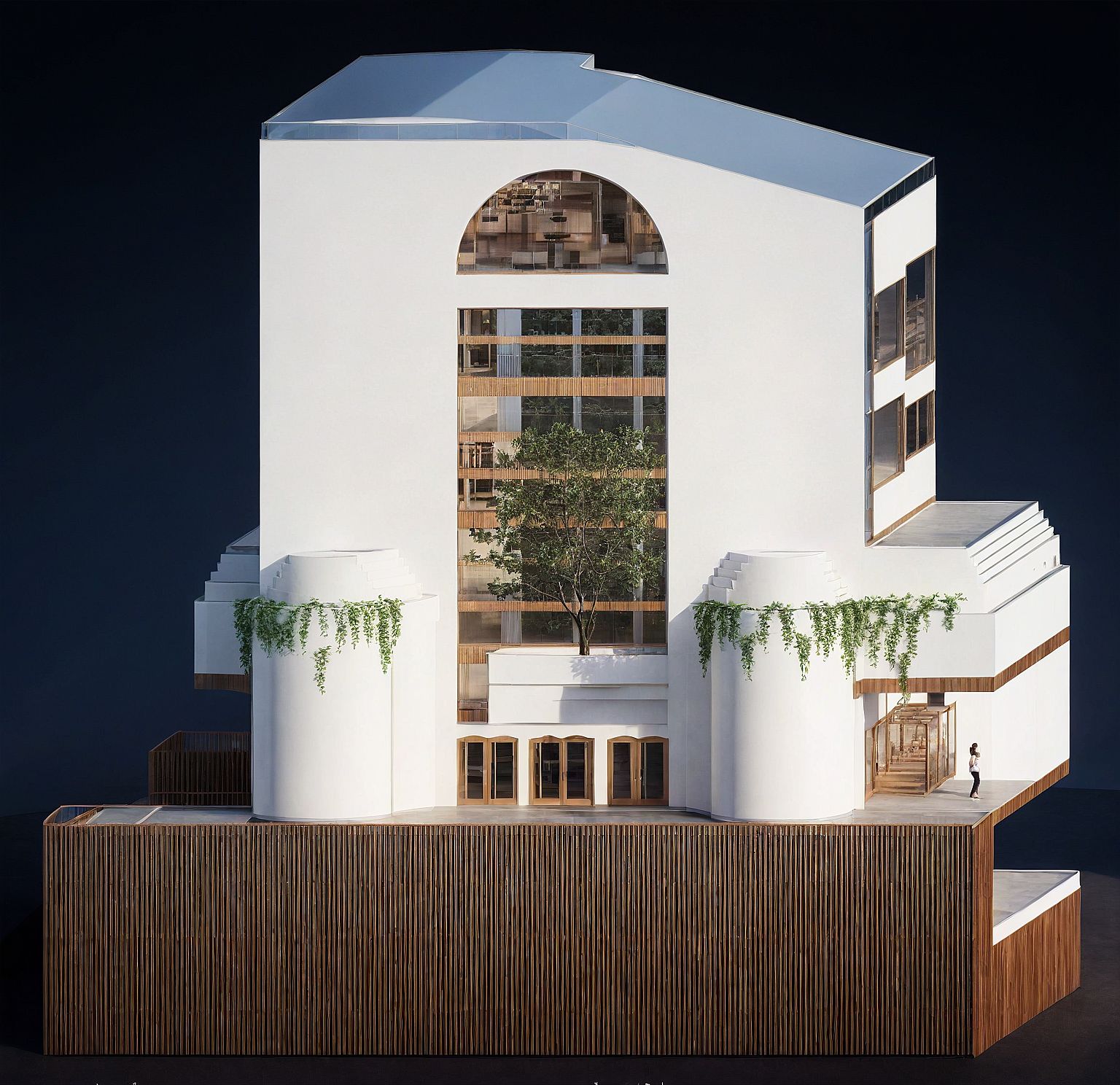 'Haven' - a wellness center and library based in Kangaroo Point Brisbane. The center is 5 storeys and a basement with a gym, bathhouse, meditation, message and therapy zen zone and a library with bookable meeting rooms on the top level. This image is an elevation. the centerpiece of the project is the indoor tree bringing a breathe of fresh air and openness into the space. the indoor part of the building is filled with natural lighting from the large front window as well. Also a key part of this building is that from front on elevation view and behind the tree, instead of seeing too much into the building itself, we see a wall of stunning polished bronze three elevators that run through the whole building. And we cannot see it in this view, but there is also a large feature of stairs that go around the tree throughout the whole building as well. Please feel free to add some tasteful lighting to appropriate levels and places on the outside too such as beside the doors. and It would be nice to see the vine continue around the building at the height that it is at at the front of the building too. Could also try to add some tasteful small framing to what is the large window in the front of the building.