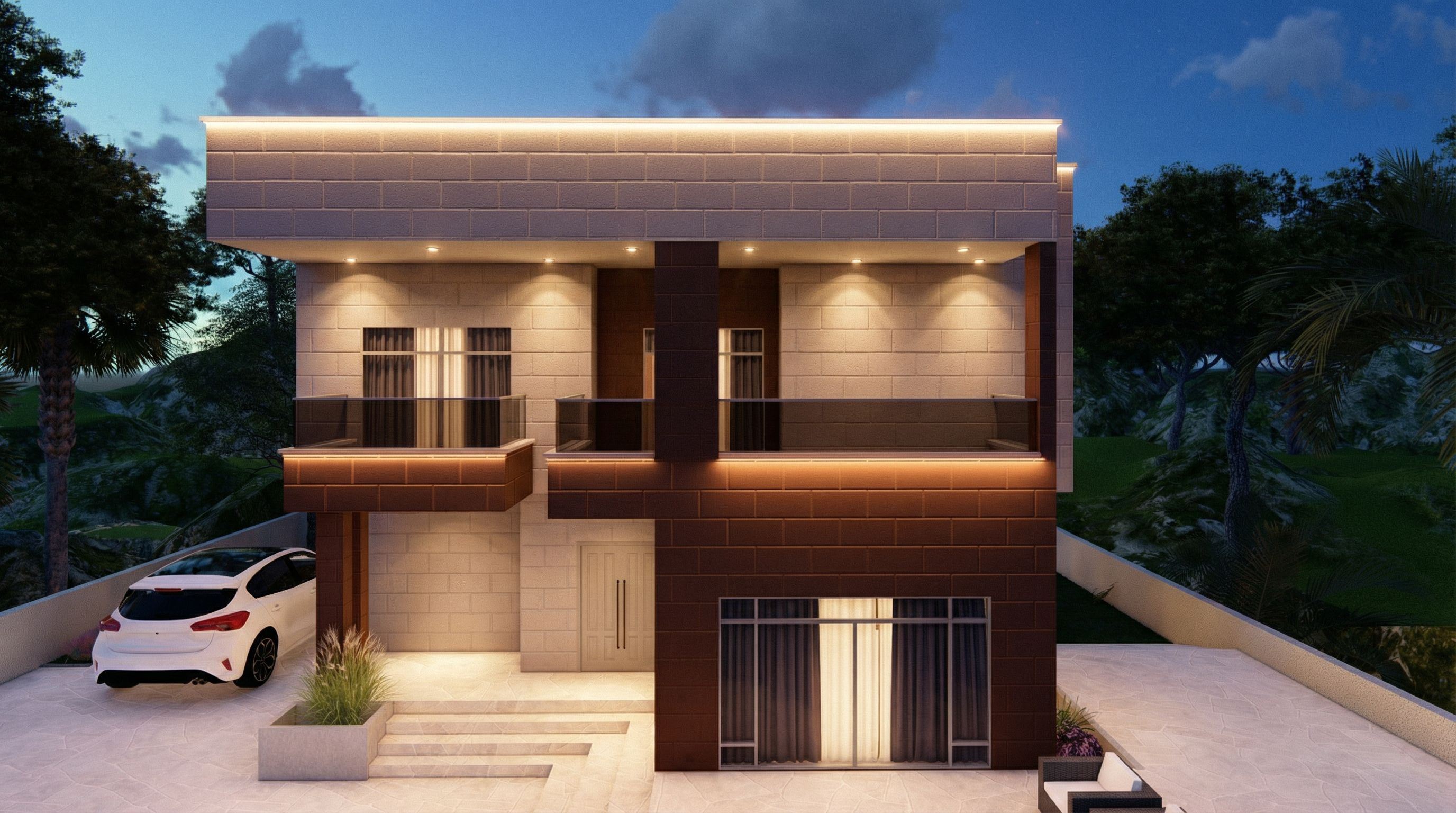 PromptPhoto of a contemporary residential building featuring striking geometric forms, blending textured stone and warm brown cladding. Surrounded by lush greenery, the scene captures a serene suburban setting with distant hills. Soft, golden hour lighting highlights the architectural details, creating gentle shadows on the façade. The camera angle showcases the entrance and balcony, framing the composition with a hint of the driveway where a white car is parked, inviting a welcoming atmosphere. dont change materials just add lighting to the wall please doing the fabric curtain at the ground floor like the curtain at the second floor, keep exact camera angle