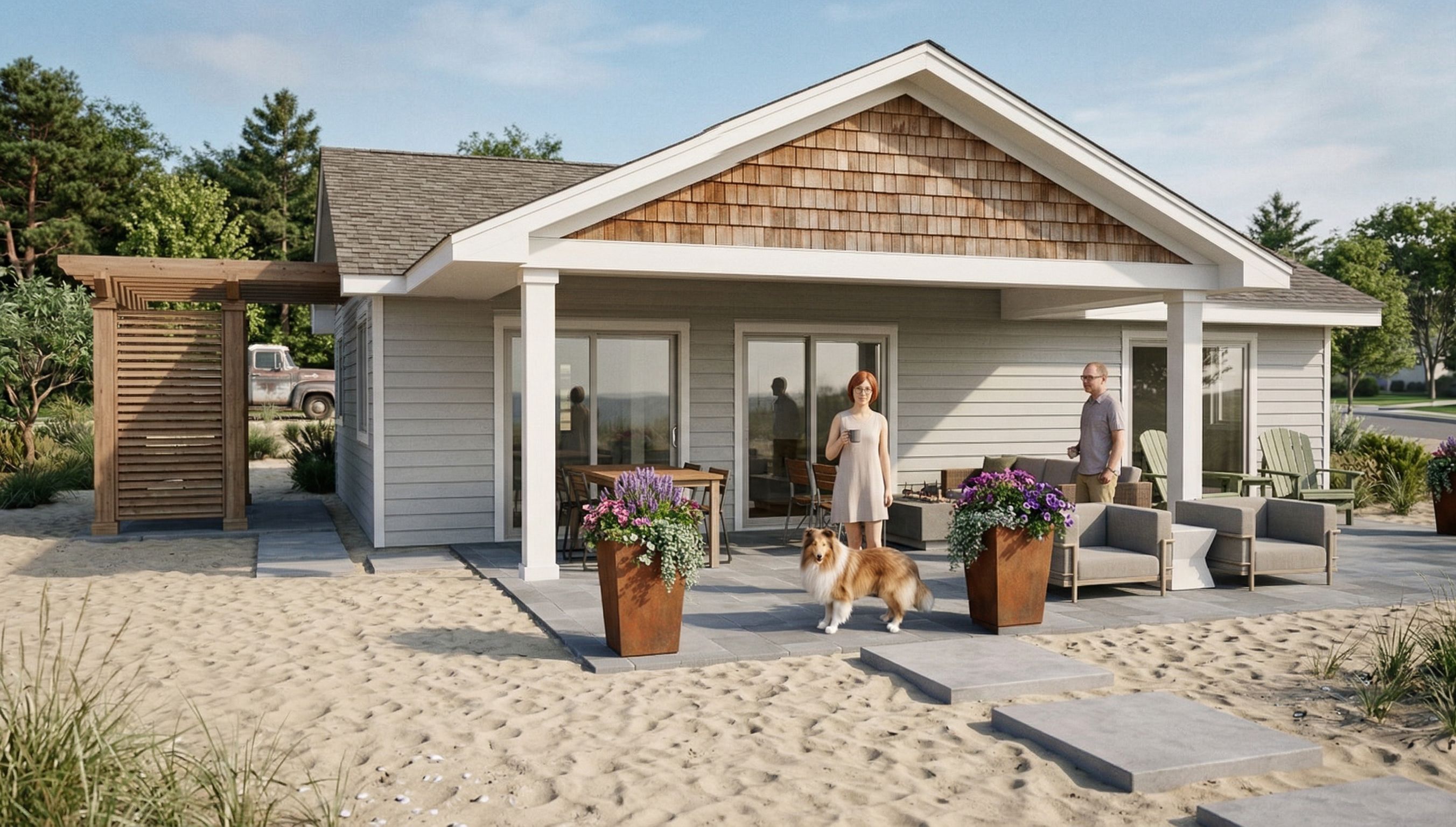 PromptPhoto of a contemporary BEACH home single-family home featuring a welcoming front porch with a cedar shake gabled roof. Highlight the light gray horizontal lap wood siding, large glass sliding doors, and decorative planters filled with vibrant flowers. Set in a tranquil suburban neighborhood with lush green trees. Natural daylight casts soft shadows, enhancing architectural textures. Captured from a low angle to emphasize the front elevation and outdoor seating, using a wide-angle lens to create a sense of space and warmth. Sand in the yard., keep exact camera angle