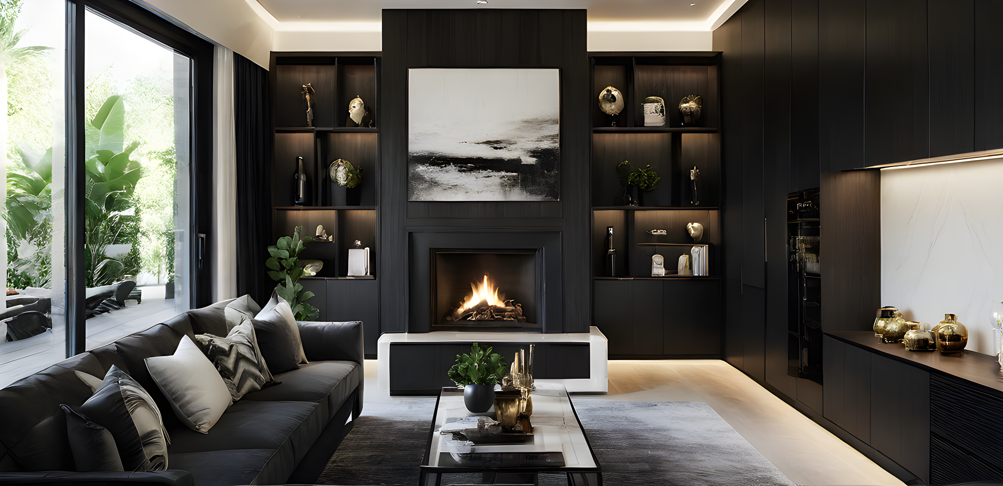 livingroom with cabinets in black oak satin finish and white walls