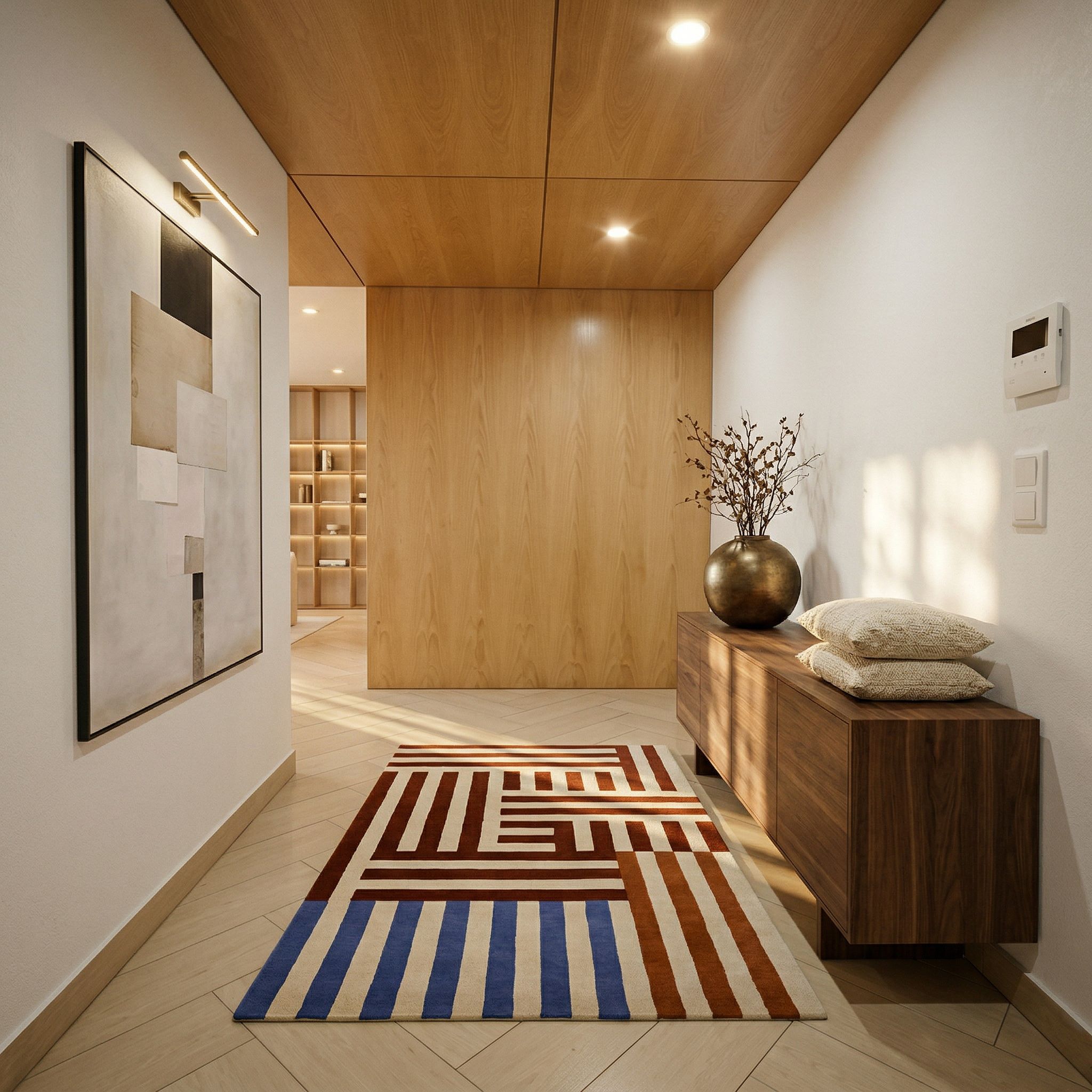 PromptColocar um aparador de madeira do lado direito conforme referĂȘncia. Colocar tapete conforme referencia. luzes acesas. colocar um quadro na parede esquerda , keep exact camera angle