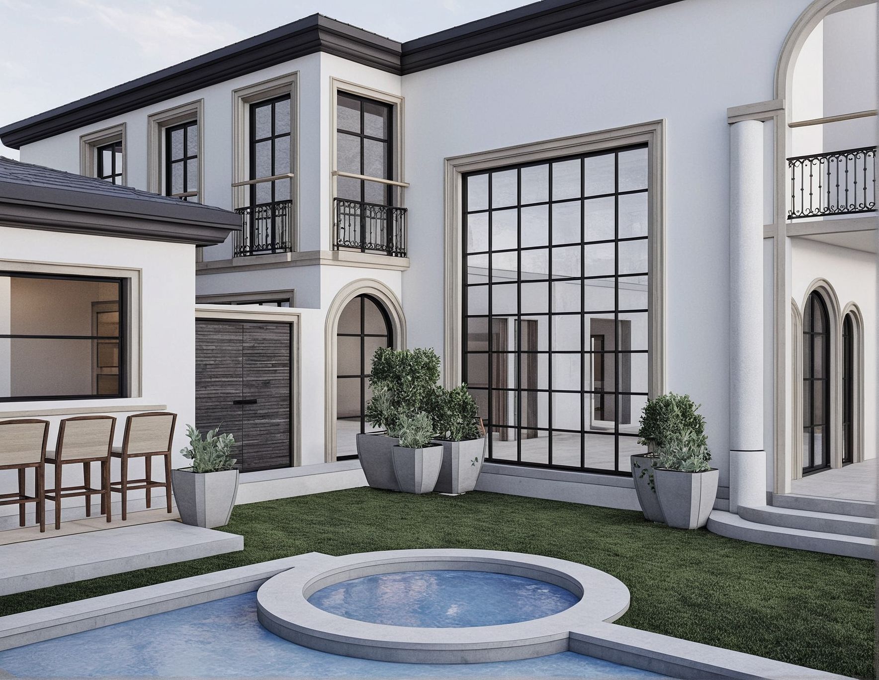 PromptPlease create a high-quality, photo-realistic render of a modern cream white villa featuring black-framed windows and doors for a sharp, contemporary contrast. The villa should have dark roof tiles—preferably charcoal or slate—to complement the sleek design. Incorporate warm ambient lighting to accentuate the architectural lines and add a welcoming glow, especially around key features like entrances and window frames. The surrounding landscape should include lush green grass and mature trees to soften the structure and add a natural, serene touch. Ensure the render captures realistic textures and depth, highlighting smooth painted surfaces, reflective black metal frames, textured roofing, and rich, vibrant vegetation. The overall mood should evoke early evening or golden hour, enhancing the ambience and elegance of the home, HD and photorealistic