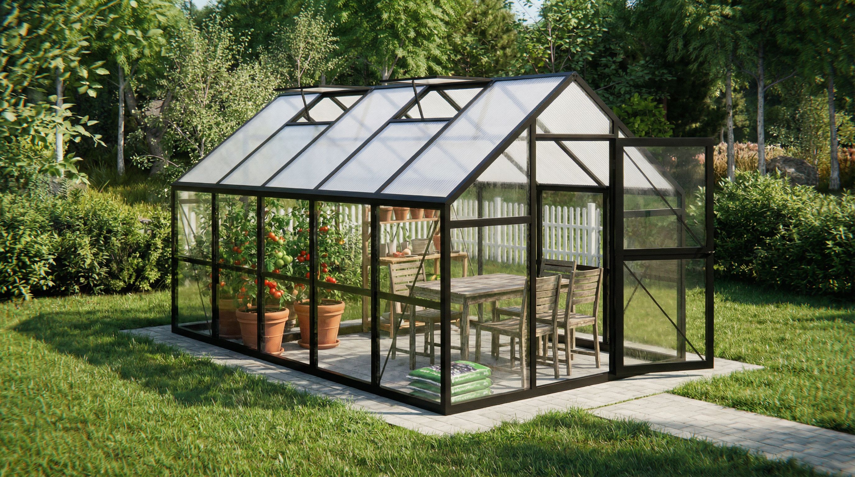 I want to request two changes to this render: 1. Can you change the interior in the uploaded image while keeping everything else the same? Use the interior from reference photo 1 instead; chairs and table? 2. Can you altså change the glass roof of the greenhouse to the white semi-transparant roof we have in the reference photo 2?, keep exact camera angle