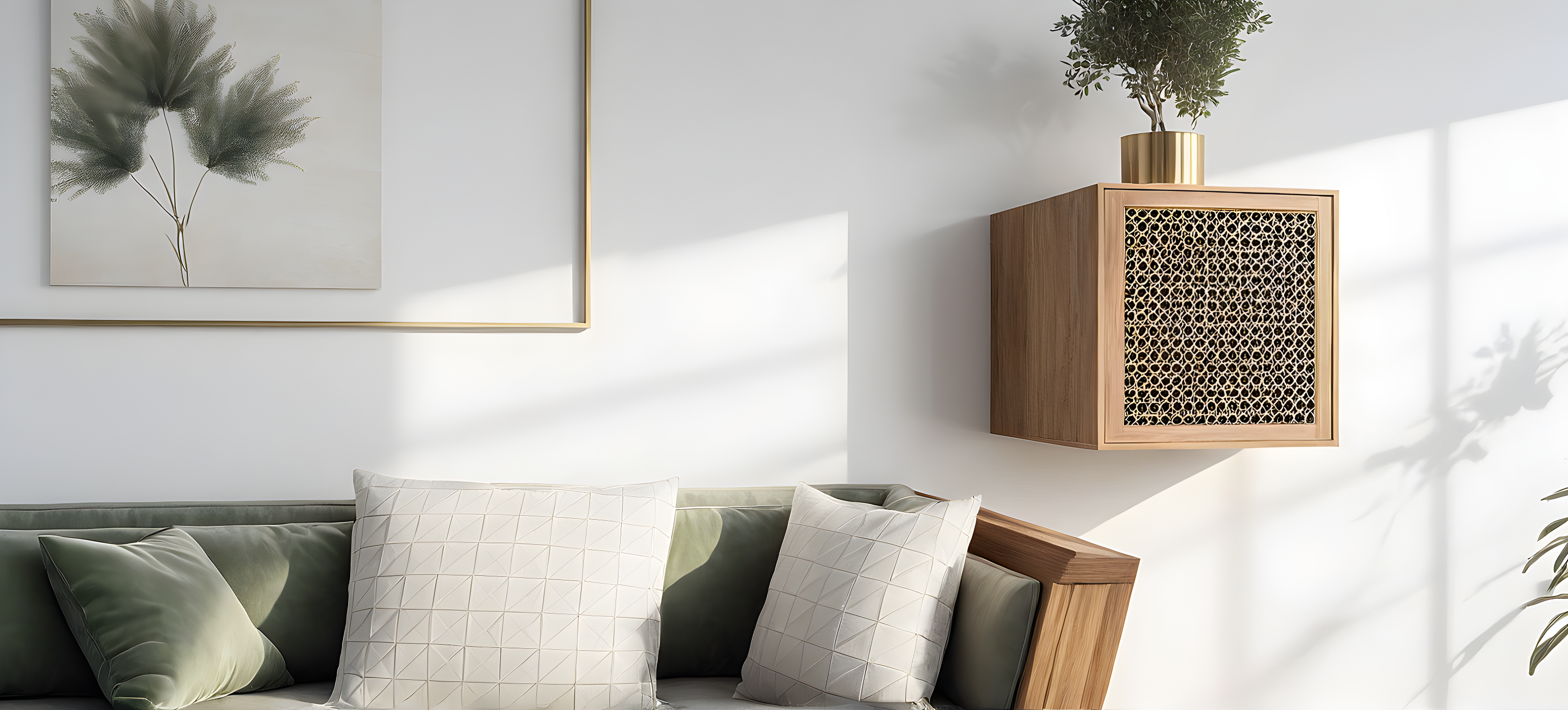 PromptSketch drawing of a box cabinet made of light nogal wood and a minimalistic style sofa with sage pillows. Against a white light textured wall with a painting with a golden frame. Vase and plant over the cabinet. Please keep the render as close to the drawing as possible. Do not make changes to the design of the cabinet or the sofa.