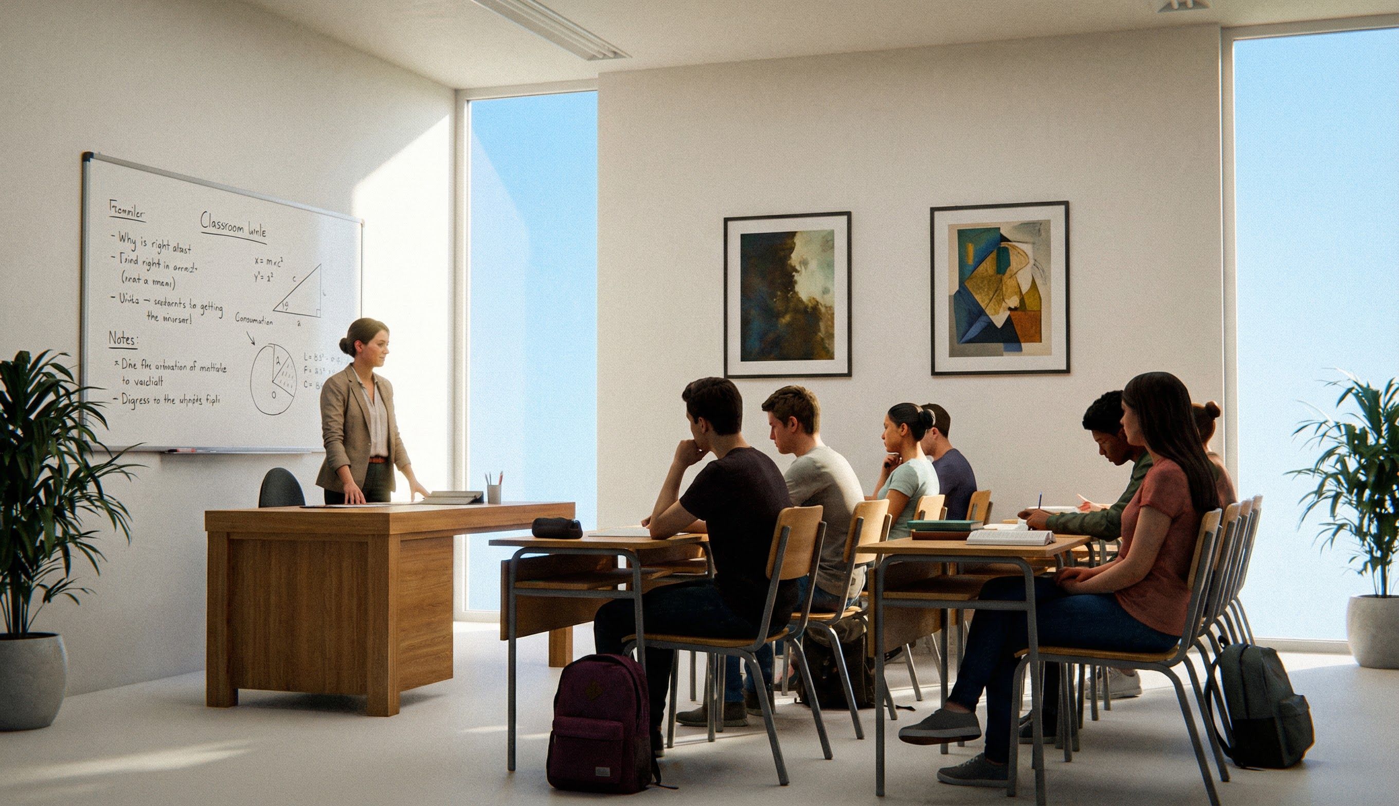 PromptDO NOT ADD ANY EXTRA WINDOWS DO N OT CHNAGE THE PLACEMNT OF THE WINDOWS KEEP THE WINDOWS IN THE EXACT PLACE THEY ARE ALREADY IN DO NOT FUCKING CHNAGE THEMclassic classroom add people make it look organic add a teacher maybe a whitebord on the back LEFT wall AND 2 ART WORKS ON THE BACK RIGHT WALL looking out the 2 existing windows LITERALY ONLY THR SKY MOTHING CRAZY MAKE THE OUTSIDE LOOK NATURAL BLUE SKY NOT WHITE alll interior walls are white drywalla dn make flor also be off white add 2 plants only no mroe than 2 plants DO NOT CHNAGE THE FUCKING WINDOWS DO NOT CHNAGE THE PLACEMRNT OF THE FUCKING WINDOWS DO NOT FUCKING CHNAGE THE FUCKING WINDOWS WINDOWS STAY WHERE THEY ARE DO NOT CHNAGE THE WINDOWS