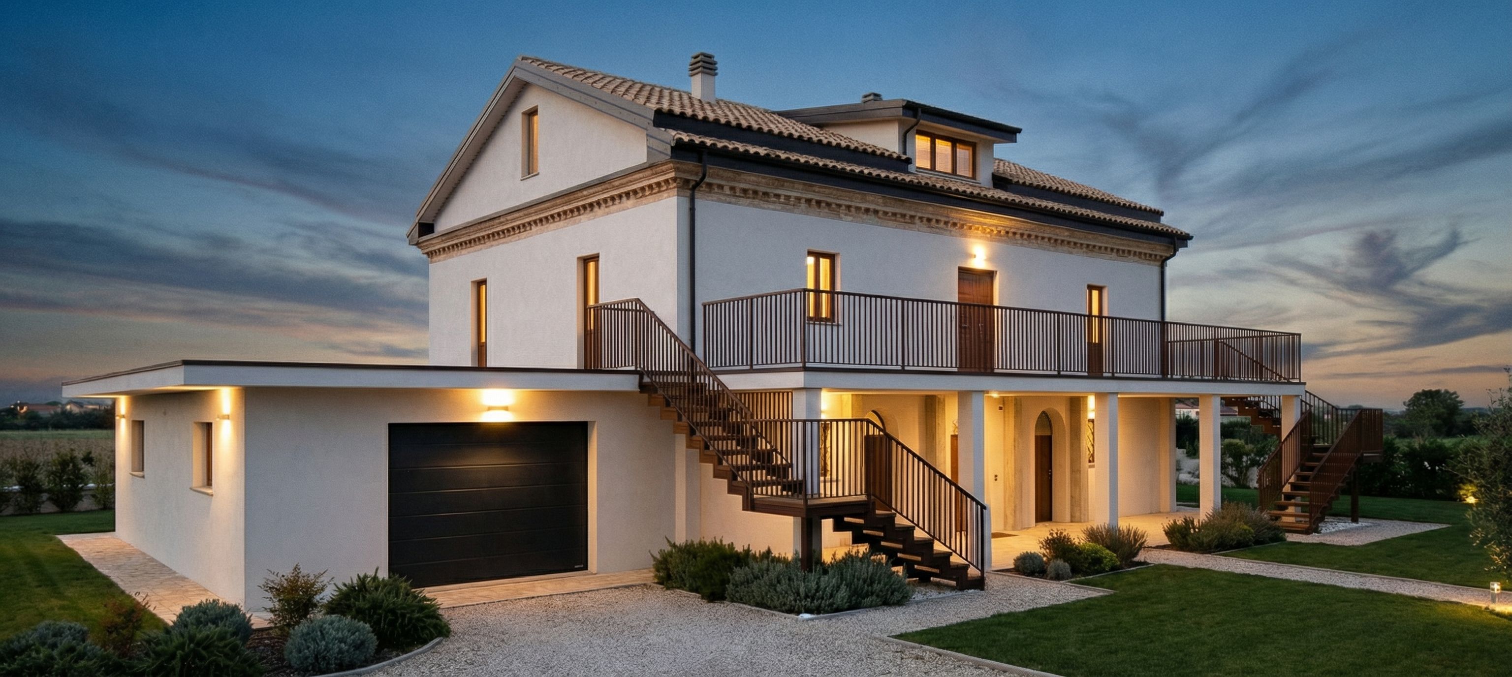 create a new image starting from base image; use the same materials as the reference image1; add dark brown metal railings to the stairs and first-floor terrace., keep exact camera angle
