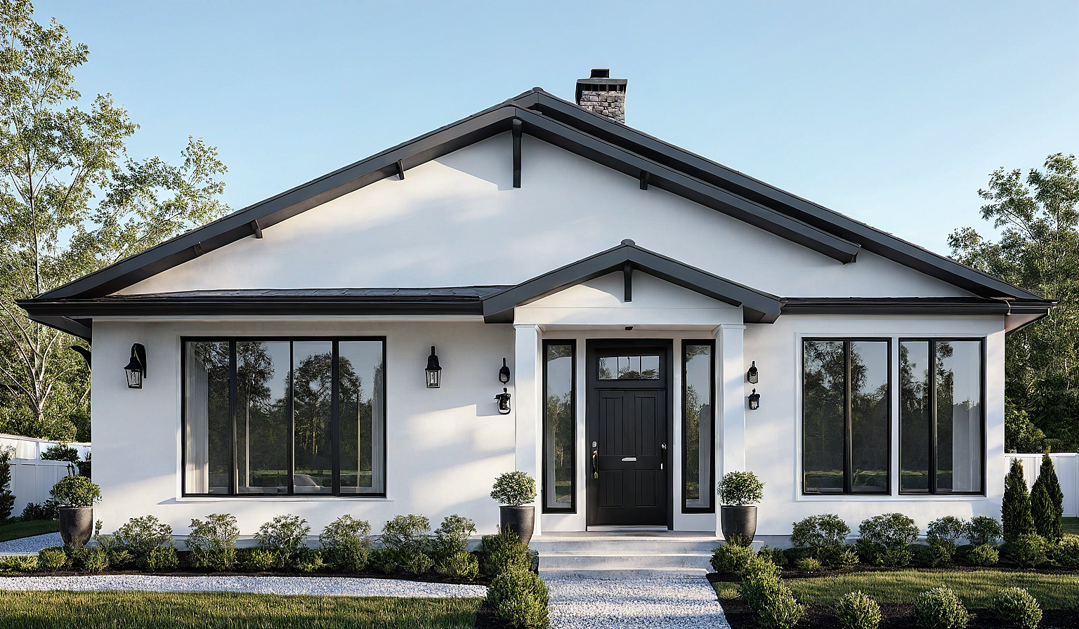 Promptwhite stucco black trim and a front porch oppisite side in frontof the door to the side of the house