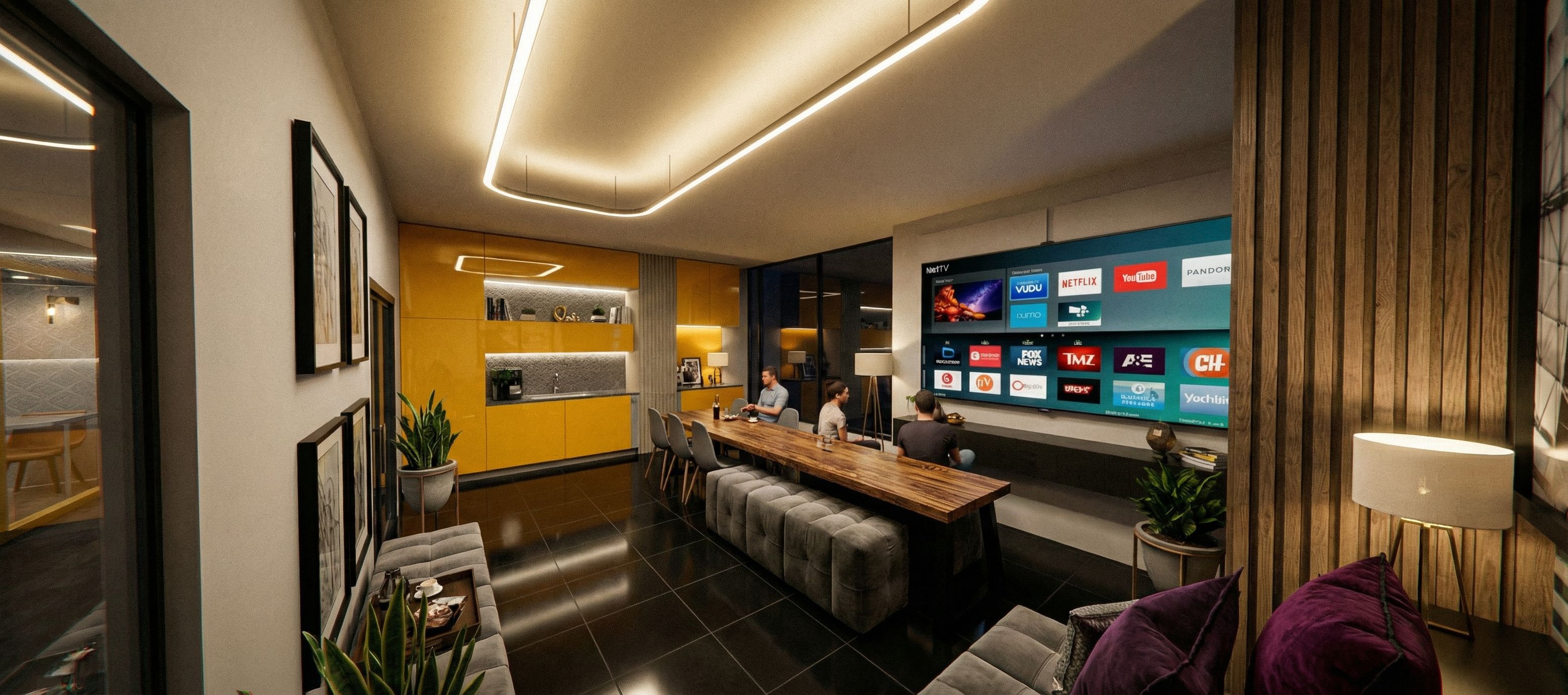 Prompta photorealistic render of an recreational room, black tiled floor, rich materials, clean line, linear light in the ceiling with grroves, wall art, keep exact camera angle., keep exact camera angle