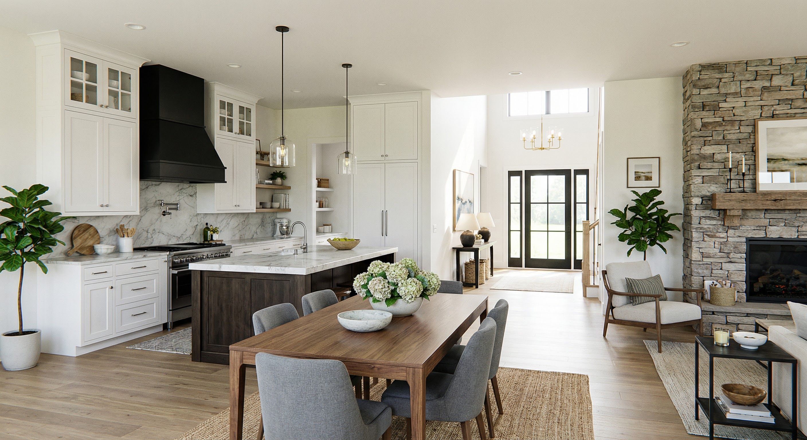 cabinets to ceiling, black style front door, small modern chandelier in front of the front window over the stairs real stone fireplace, no windows at the side, remove the side windows, keep exact camera angle