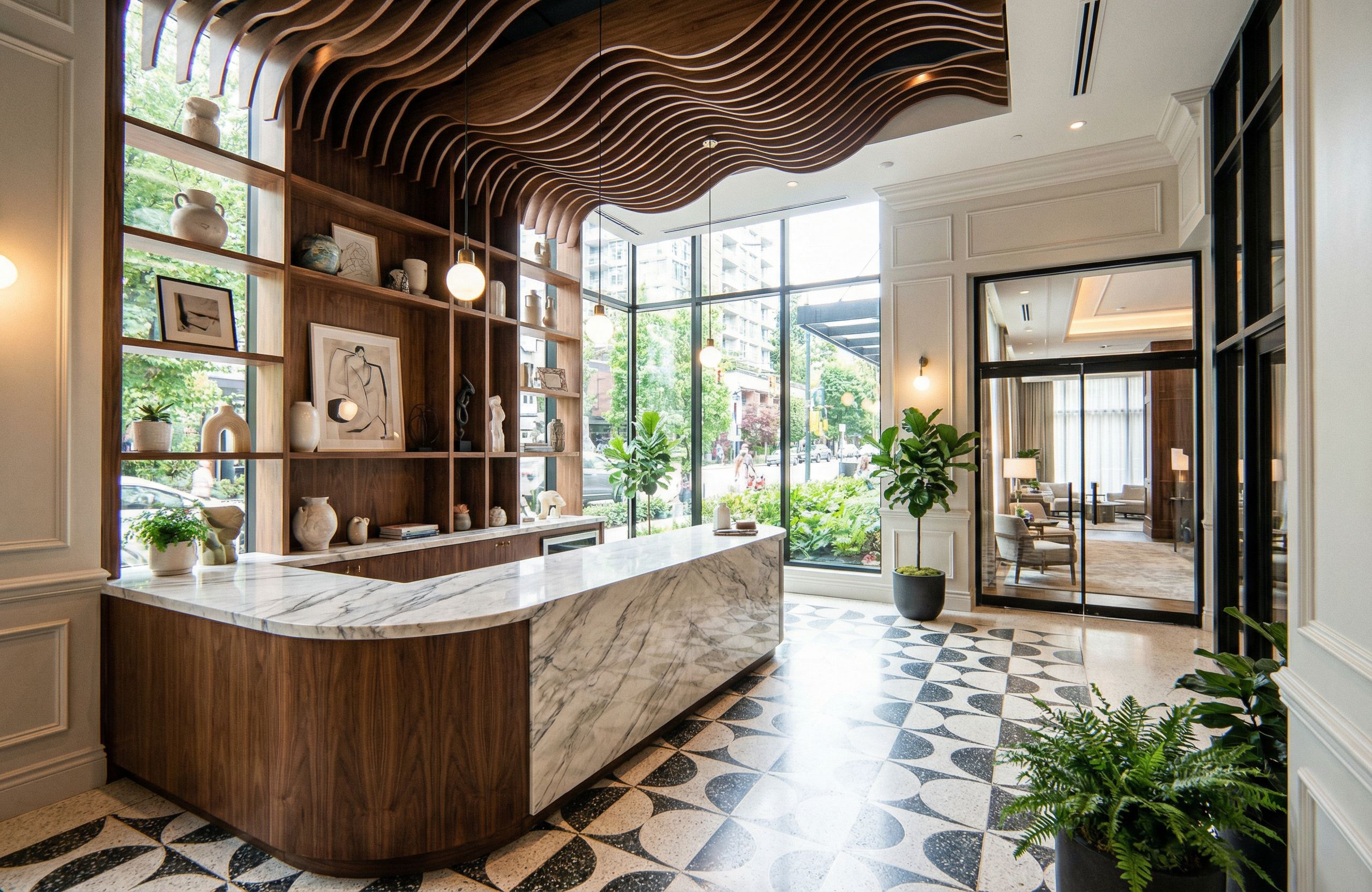 Photo of a modern interior retail space within a luxury hotel showcasing a sleek, curvilinear L-shaped point of sale area with a marble counter, and rich walnut base. glass windows allowing ample light to come in the far north and East Walls front Facade, and a unique wavy wooden ceiling design over the Point of Sale Counter that cascades into clever built in shelving behind the POS counter along the West Wall. Emphasize the contrast between the smooth textures of the marble and the warm tones of the wood. The space features a patterned floor that adds visual interest and highlights circulation areas. Lighting is bright and natural, enhancing the open feel. Capture this from a wide-angle perspective, highlighting the spaciousness and depth of the lobby while focusing on the elegant architectural details. add classical architectural elements such as wainscotting, crown molding, baseboards where applicable. Add small home decor pieces for sale. add a street view in vancouver with greenery etc out the window and doors on the North wall only doors on east wall lead to hotel hallway to enter and exit into retail area. , keep exact camera angle