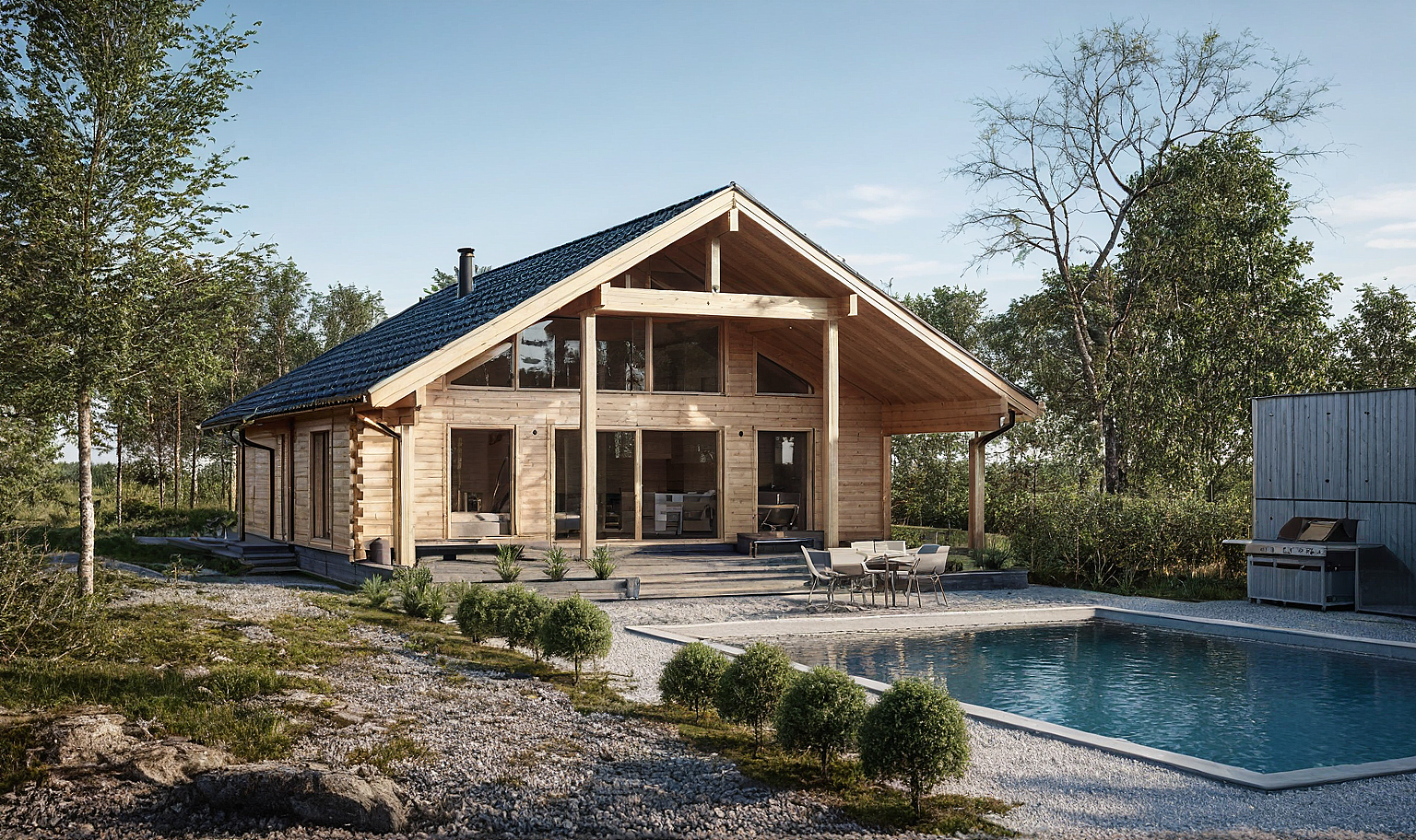 PromptThis beautiful Honka wooden house exudes warmth and natural aesthetics, perfectly integrated into the surrounding landscape. Built from premium wood, the house offers an authentic sense of nature and comfort. Large glass surfaces allow plenty of natural light and a seamless connection to the outdoors, the spacious terrace invites relaxation. ideal for a retreat from everyday stress and a connection with nature, make me summer image with pool in front.