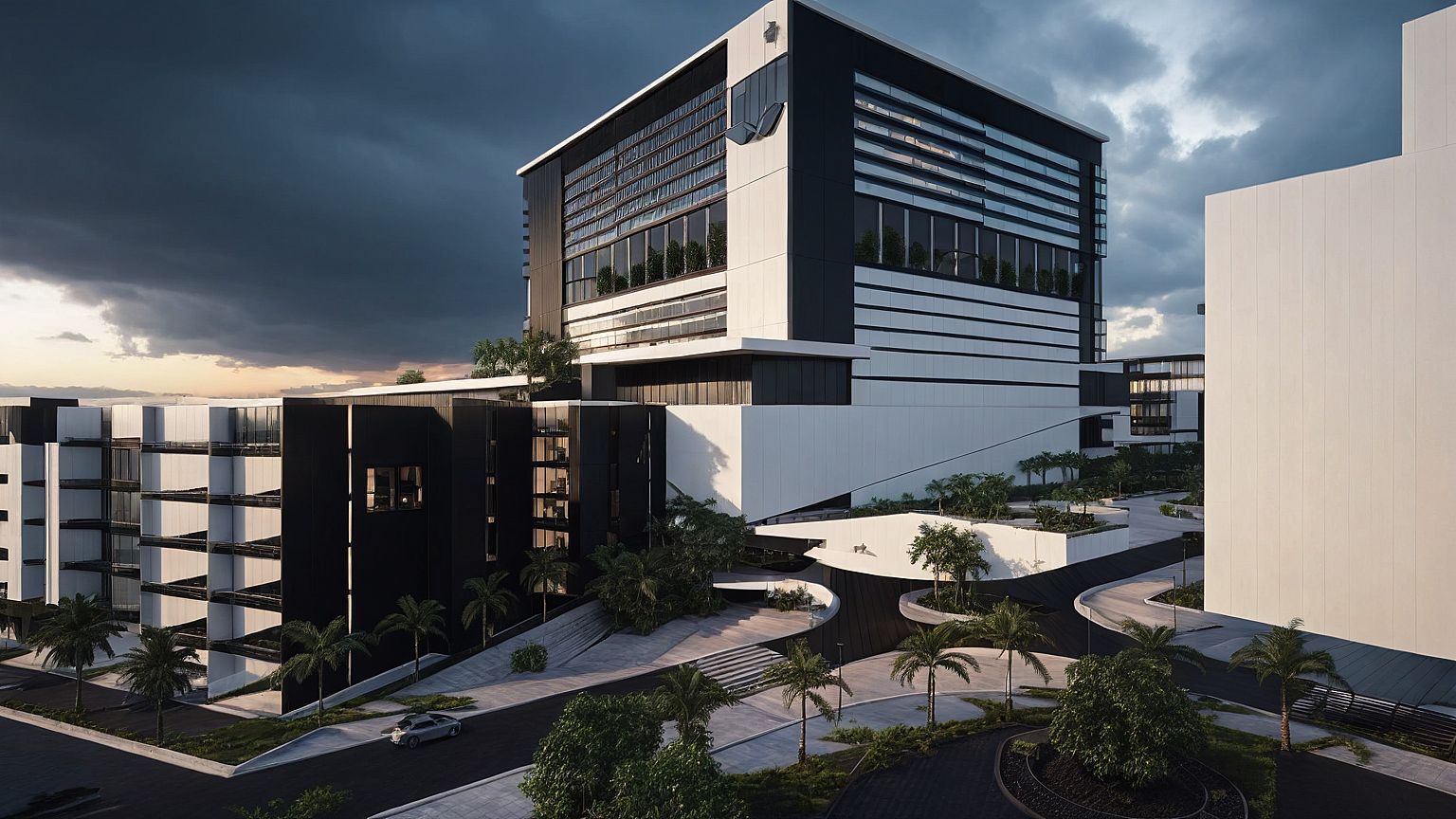 Heavy overcast + raining + dusk sunset + Additional vegetation + Modern building facades + Steel black with glazing finish to all windows + lighting + sky rail color white