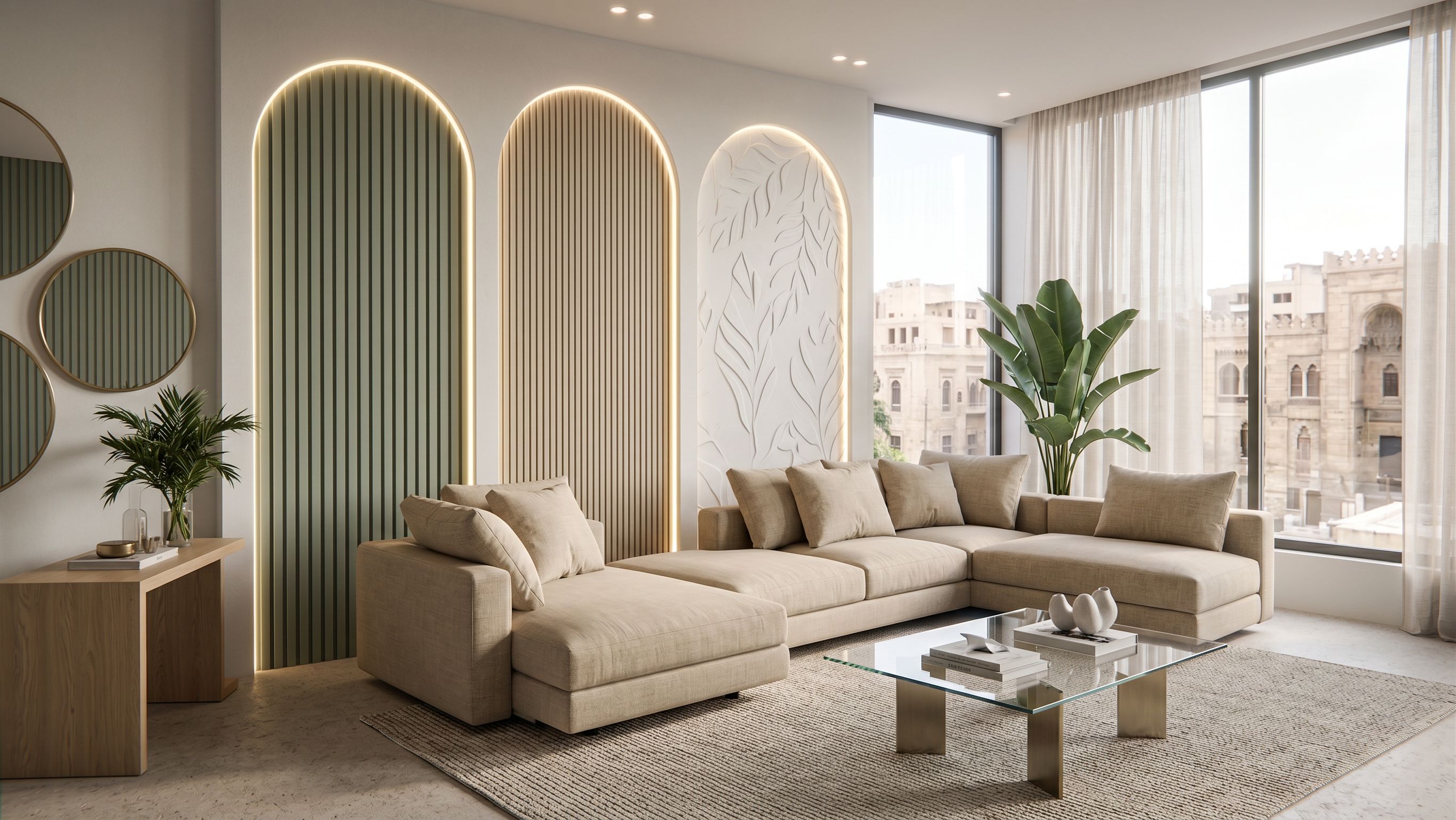 Promptmodern minimalist living room interior, L-shaped beige linen sectional sofa with chaise on right, glass coffee table with metal legs centered on textured neutral rug, light oak side table on left, indoor plant beside sofa, round wall mirrors with thin brass frames on left wall, feature wall with three vertical arches: * left arch: sage green fluted wall panel * middle arch: beige vertical ribbed panel * right arch: white sculptural plaster wall with leaf relief pattern, hidden warm LED strip lighting outlining arches, soft indirect ceiling spotlights, large floor-to-ceiling window on right side with sheer curtains, natural daylight entering from right, STRICT RULES: * preserve exact camera angle and perspective * keep identical layout and proportions * do not redesign architecture or furniture * do not move objects * keep same wall design and arch shapes * maintain same styling and decor placement MATERIAL LOCK: * beige fabric sofa (#d6c3a3 linen texture) * sage green panel (#8f9f8c matte) * light oak wood (#c8a97e) * warm white plaster wall (#f2efe9) * brushed brass accents * clear glass table LIGHTING: soft natural daylight from right window, warm ambient LED strips (3000k), balanced exposure, no harsh shadows CAMERA: eye-level shot, 35mm lens, centered composition, straight-on view STYLE: photorealistic, ultra detailed, interior photography, soft shadows, realistic textures. BackGround: Cairo buildings. strictly preserve camera angle, same perspective, same composition, no changes in layout, no repositioning of objects keep exact wall design, same arches, same panel shapes, do not redesign architecture, keep exact camera angle