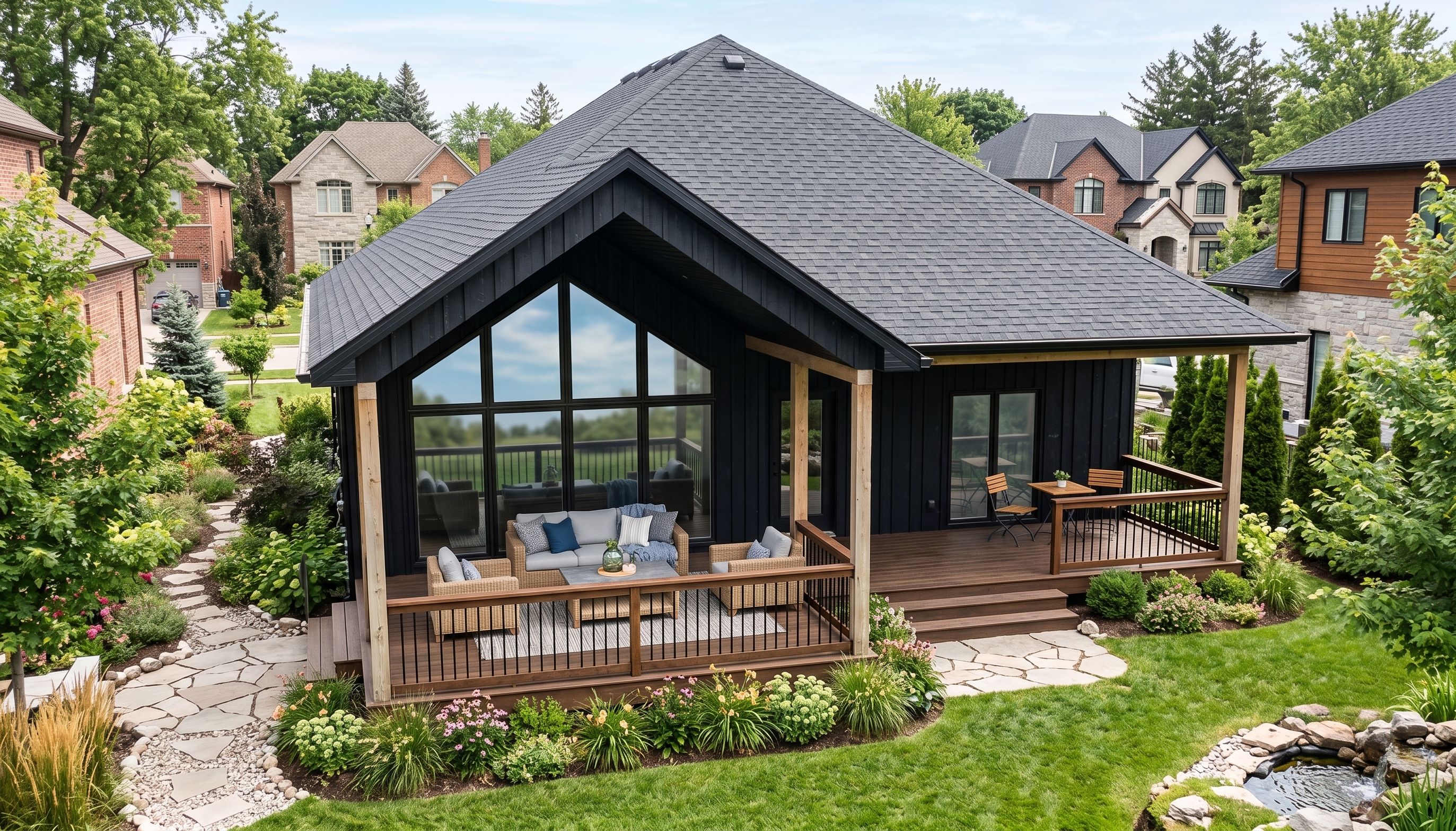 show a raised covered deck with railing and black spindles, show patio furniture and a perfect backyard oasis, house shown in a commuinty with neighboring homes , keep exact camera angle