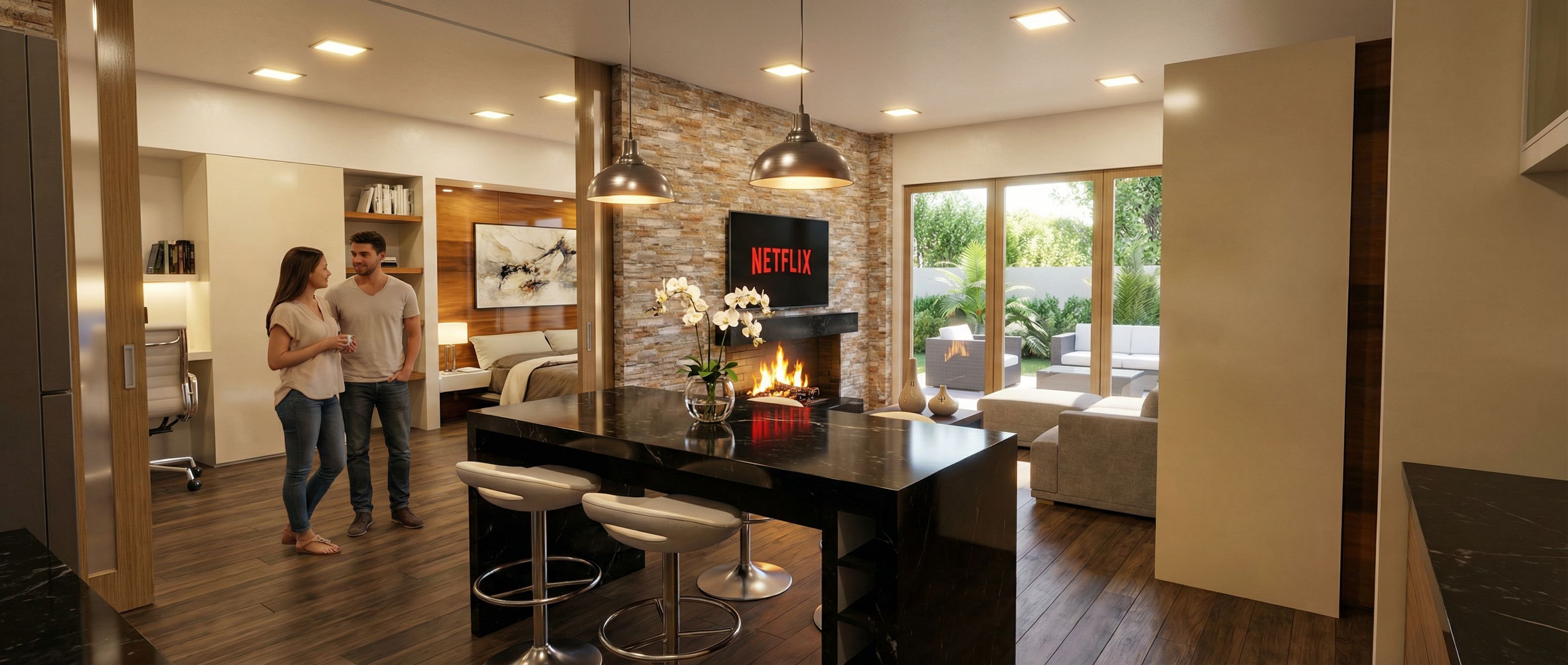 interior design rendering, render this sketch into photorealistic rendering, COZZY ILUMINATION WITH SQUARE RECESED LAMPS, FLOOR SEMI BRIGHT, KITCHEN ISLAND IN BLACK MARBLE, CHAIRS WITH METAL SHINNY LEGS, YOUNG AND BEAUTIFUL COPPLE STANDING, 2 METAL PENDANT LAMPS OVER ISLAND WITH WARM LIGHT, VASE WITH ORCHIDS, EXTERIOR WITH A SONNY DAY AND EXTERIOR MODERN PATIO FURNITURE, TV WITH NETFLIX LOGO, FIREPLACE REALISTIC, BACK WALL FROM THE BED ROOM IN SHINNY WOOD, BEAUTIFUL PAINTING OVER THE BED., DOOR WITH TRANSLUCENT GLASS IN THE WALL BESIDE DE OFFICE, keep exact camera angle, high quality, professional, detailed scene