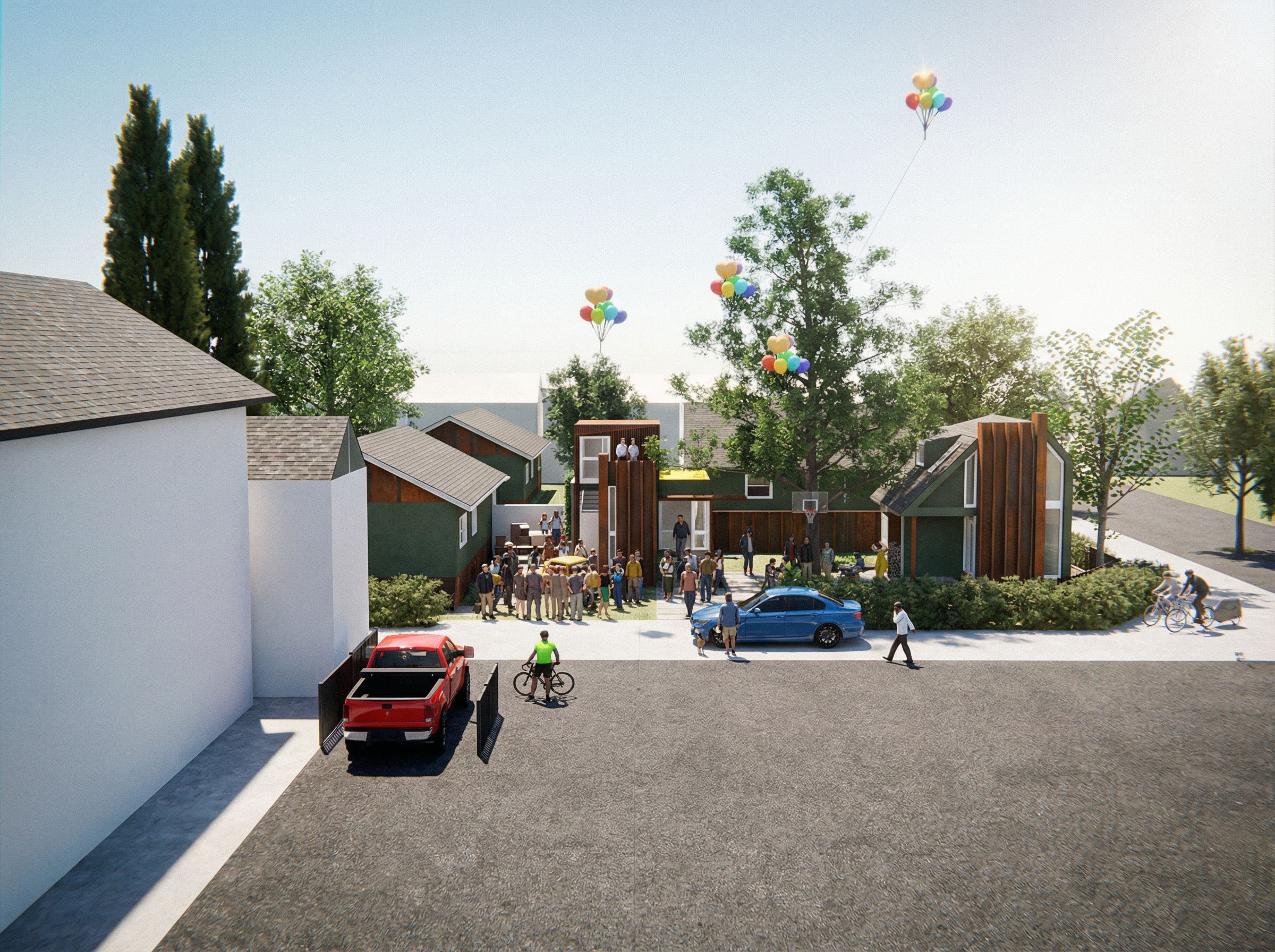 modern, rusted steel vertical elements dark green stucco wall and white window frames with trees and single storey low bungalows parallel in background, keep exact camera angle