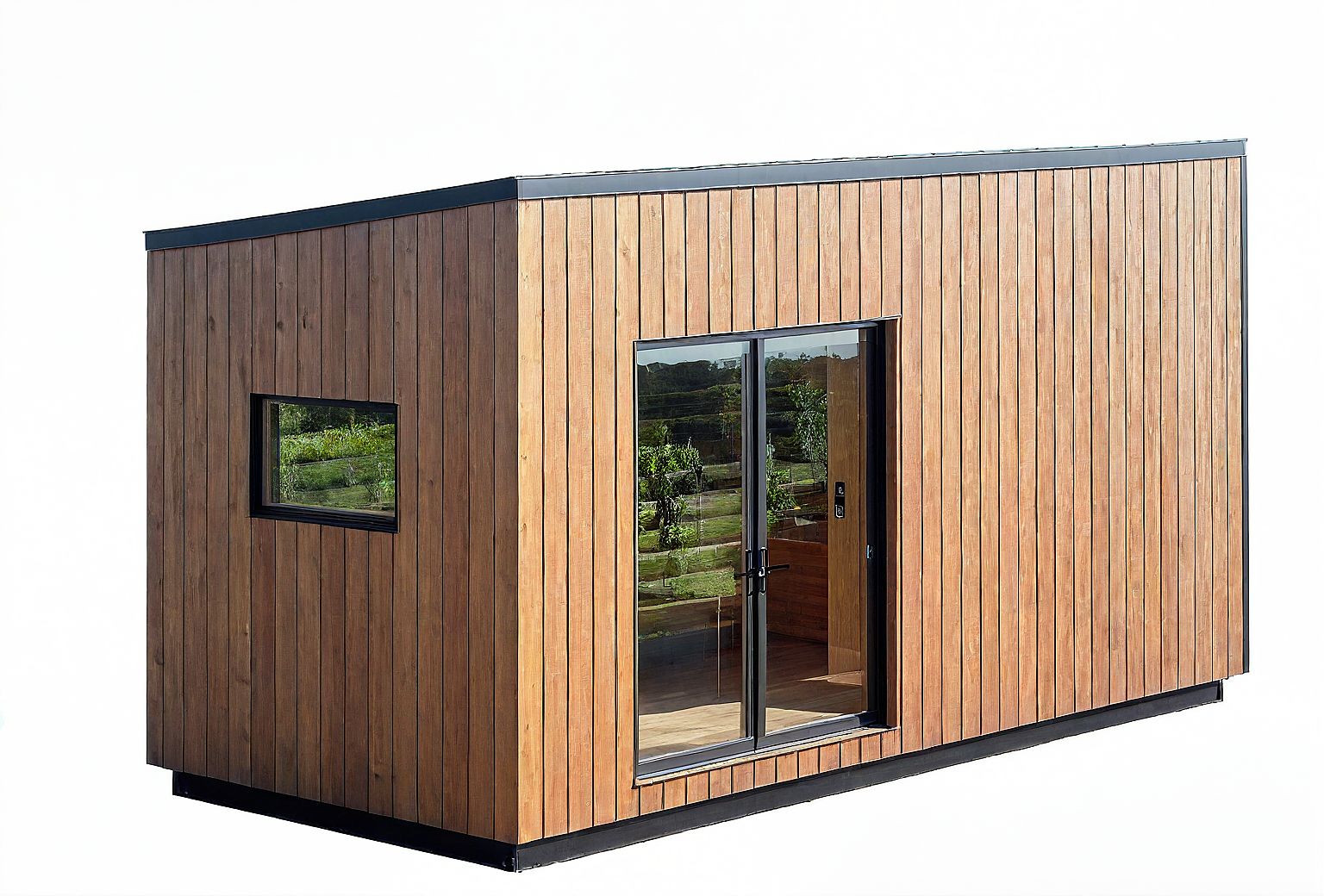PromptPhoto of a modern timber-clad tiny house featuring vertical wood siding, large glass doors, and a simple, flat roof. The surrounding urban landscape includes small greenery and neighboring structures. Natural daylight floods the scene, casting soft shadows on the house's facade. Captured from a low angle to emphasize the height of the walls and framing the glass doors prominently, use a wide-angle lens to enhance the spatial relationship with its environment, showcasing the cozy yet contemporary design.