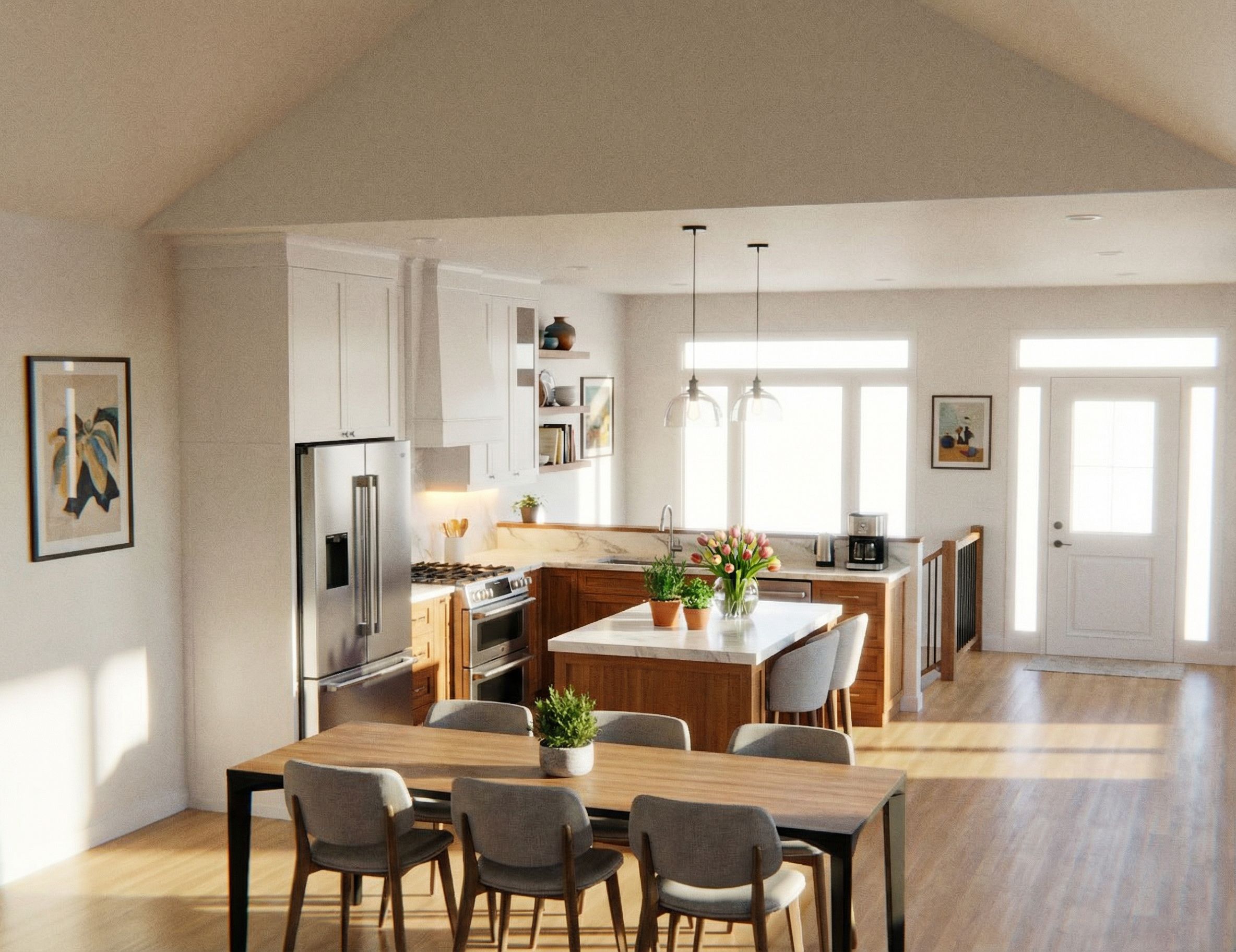 Promptdesigner kitchen, quartz counter, wood floor, wood lower cabinets, have fun with this design! full sun all sides