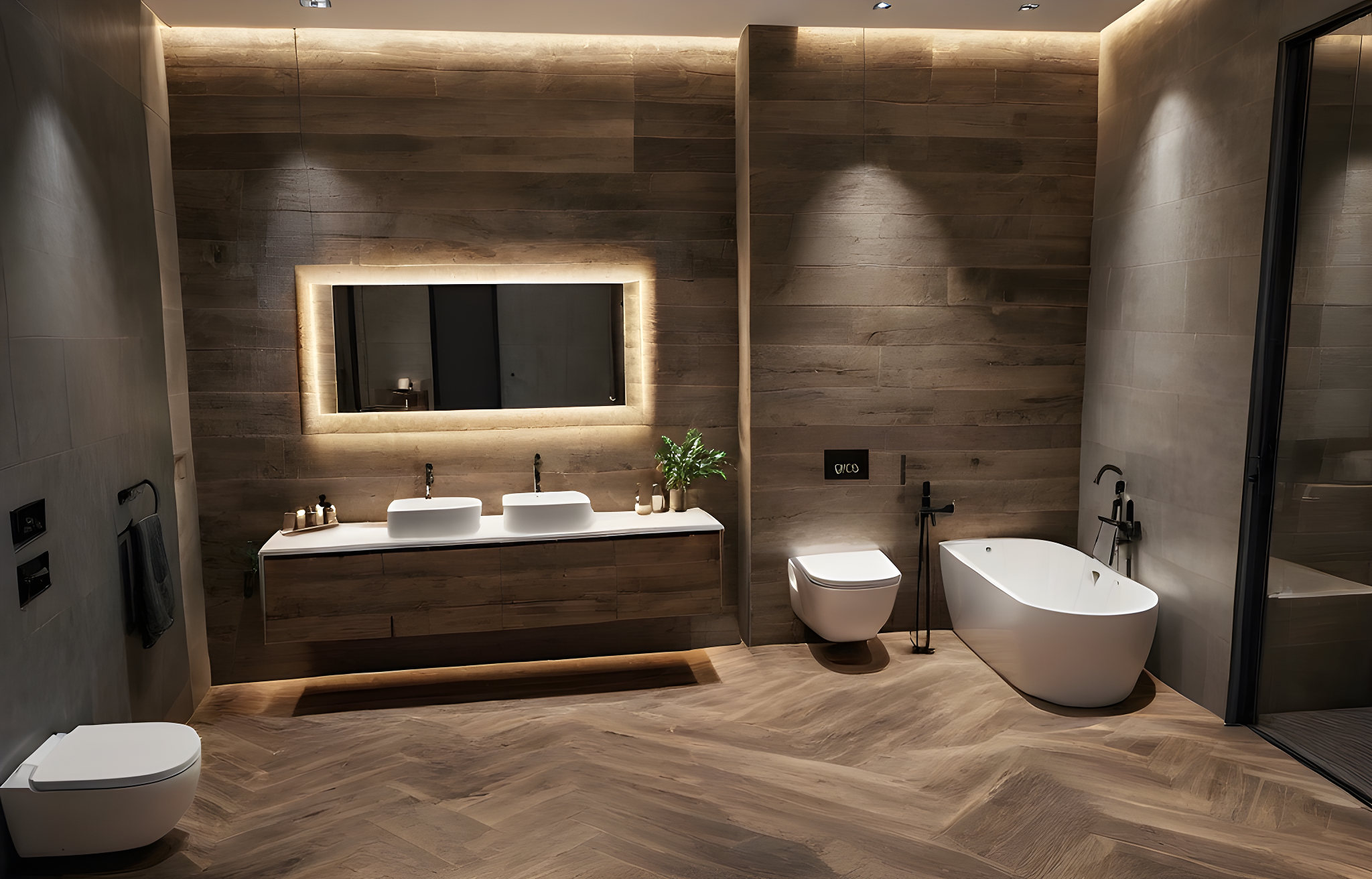 Prompti want the same design,bathtub ,i want the toilet to be more visible ,and sink remain as they are .Add the flrooring ,wall color and any decor design to this bathroom.