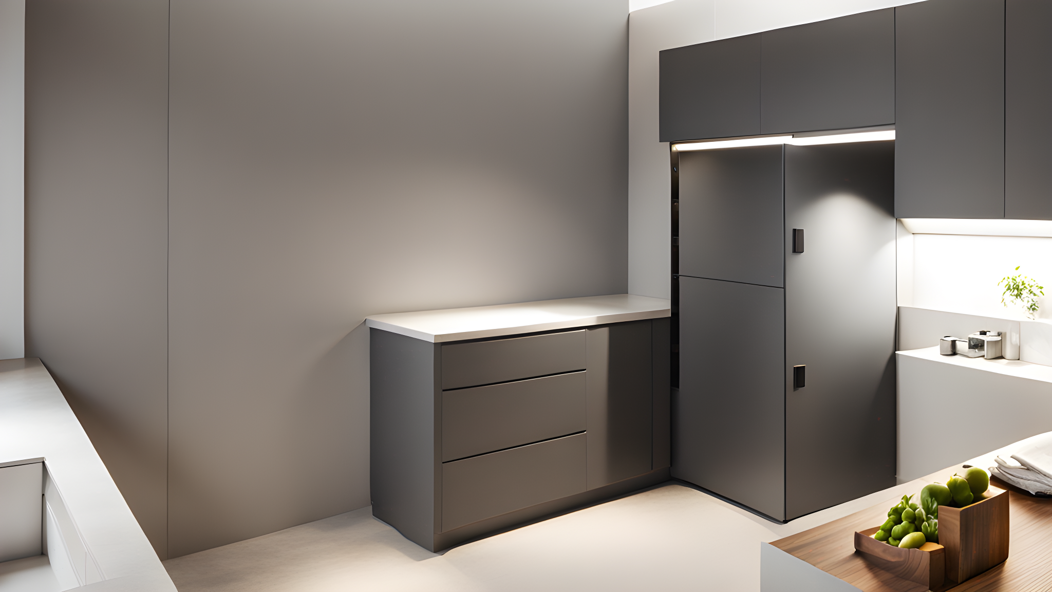Promptphoto of open kitchen counter, grey cabinets, film grain, hyper-realistic, unreal engine render