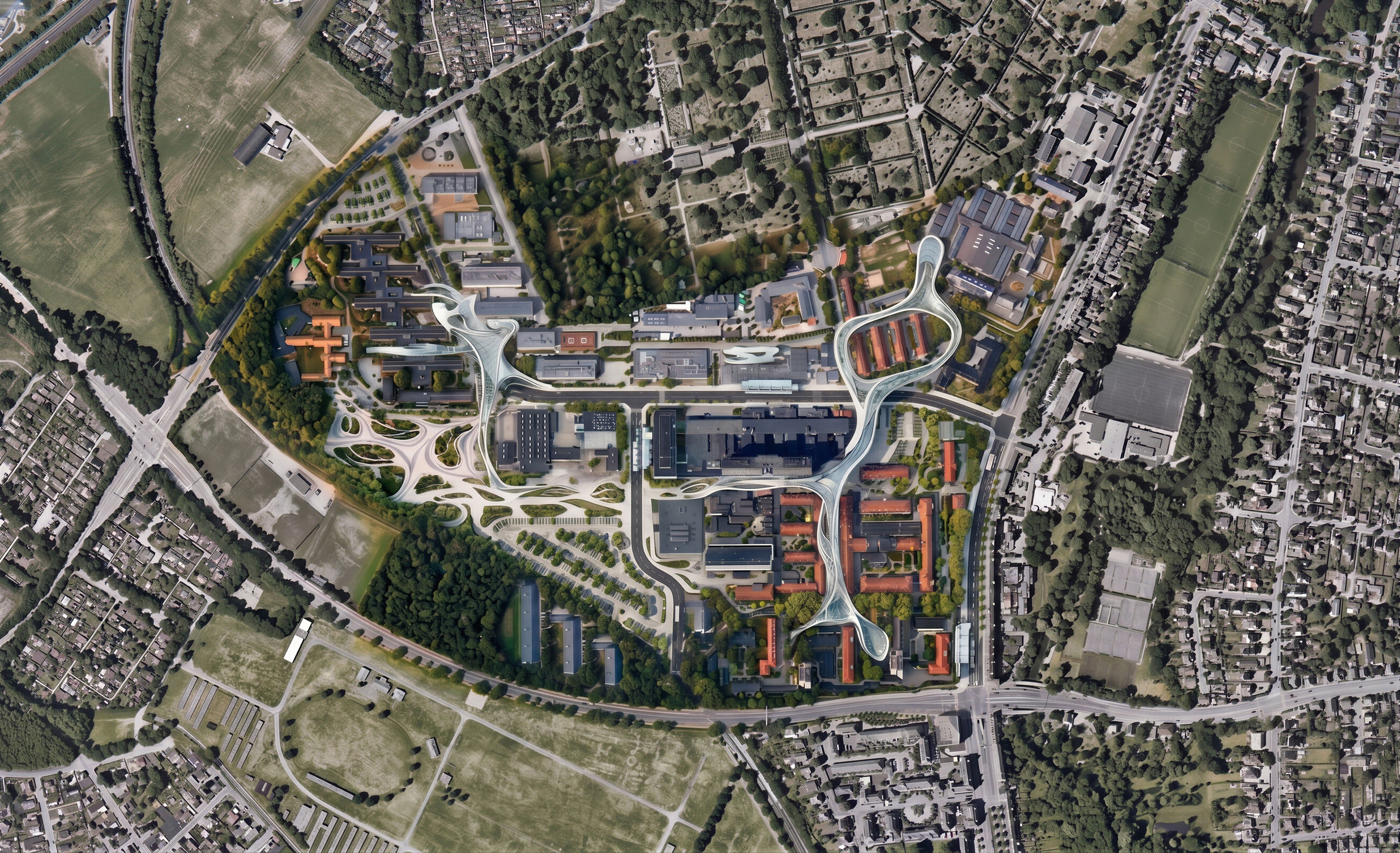EnhancedPromptEdit this master plan image. Replace the thin yellow line with a two-lane road with sidewalks and trees to the left and right, with benches and parking spaces, and three bus shelters along the line. Where there are curved magenta (purple) signs, create ergonomic structures that connect the buildings with the outside space, similar to the white metal and glass structures in the reference image. For trees and open spaces like plazas and parking lots, use an ergonomic style, similar to the lakes and parking lots on the left side of the image. Erase the red, yellow, and purple lines., keep exact camera angle