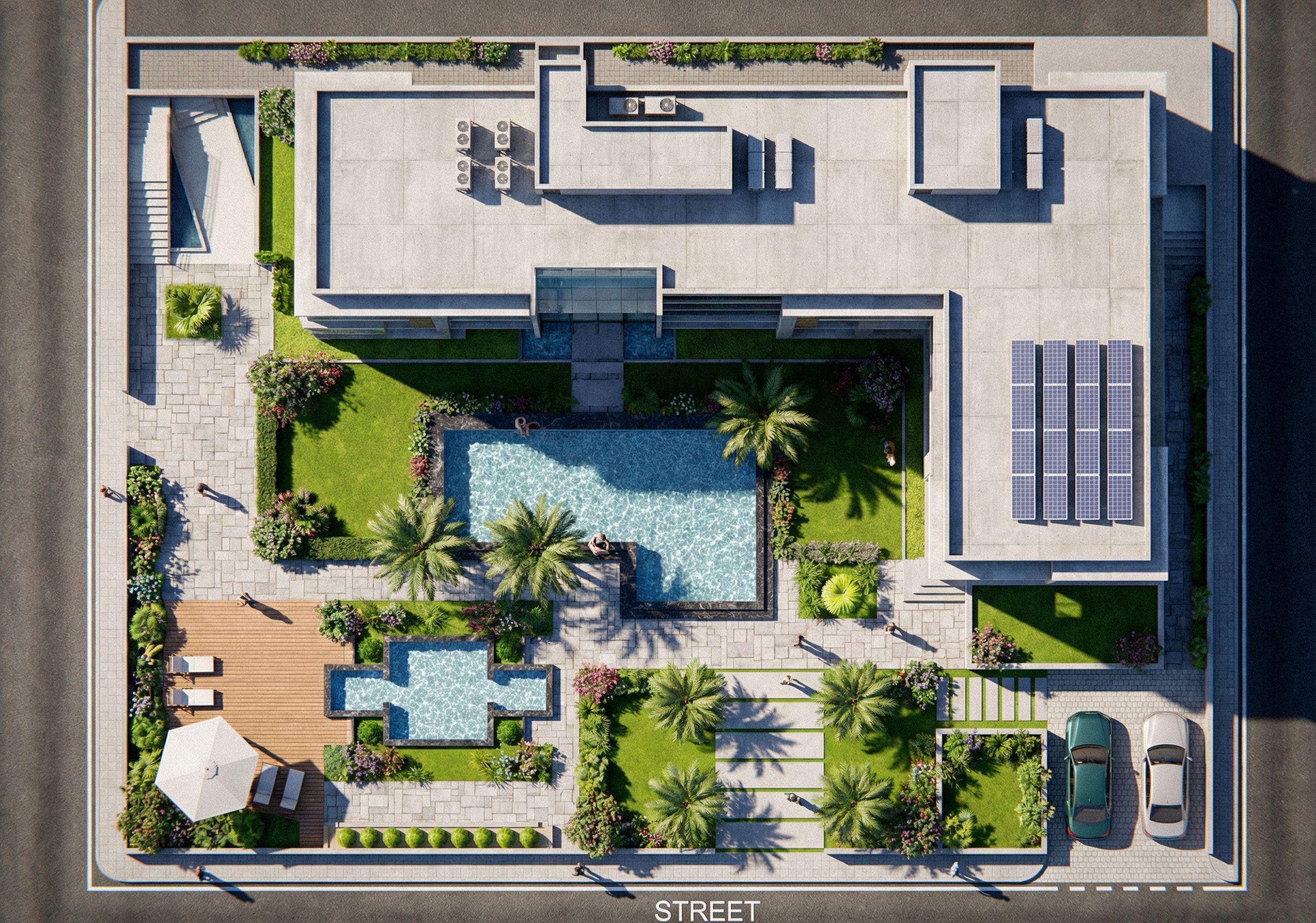 صمم الموقع العام بصورة واقعية مع الظلال مع مراعاة الرسوم الاولية للتصميم في السكيتش المرفق, keep exact camera angle