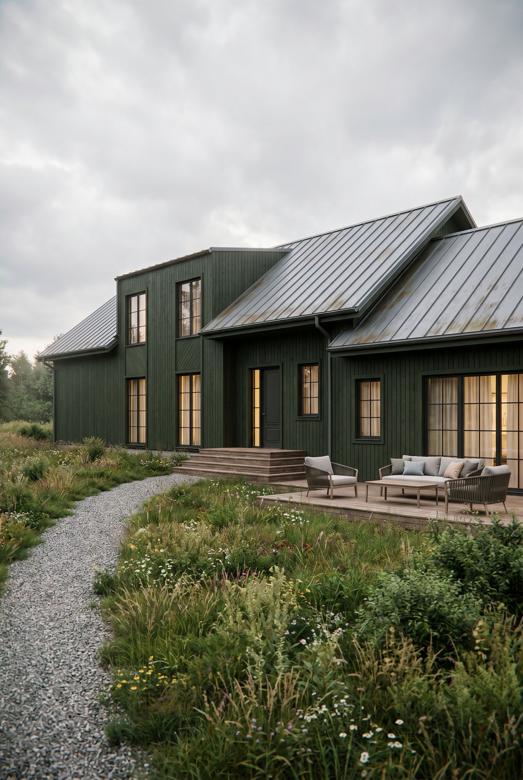 please render this house. Exterior is dark green wood facade and grey metal roof as in reference images. add some curtains at the windows. add lounge furniiture on terraace. environment is meadow like grass with some greenery. there is a pathe along house from the left corner to entrance., keep exact camera angle