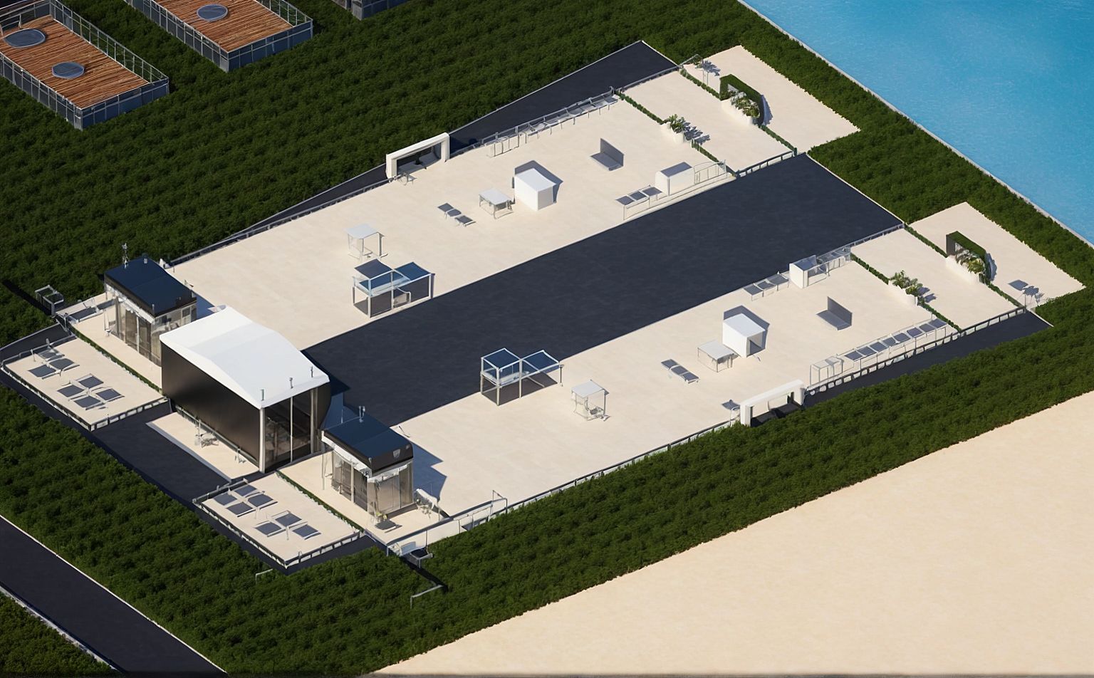 PromptFotografía de una moderna área de para conciertos y festivales. La luz natural realza los vibrantes colores, proyectando sombras suaves. Capturada desde una perspectiva picada con un objetivo gran angular.