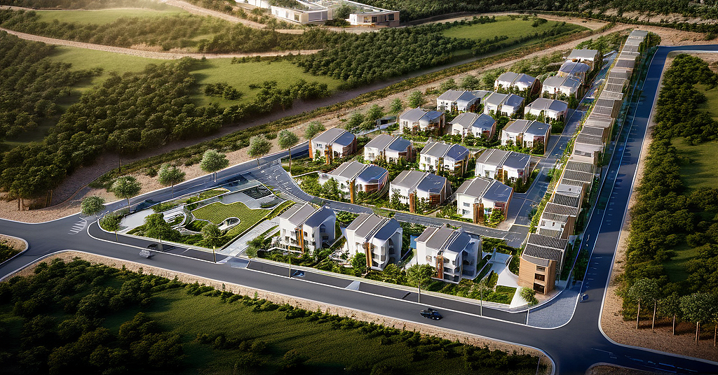 PromptA Mas Housing development complex, include people and vehicles depicting life?