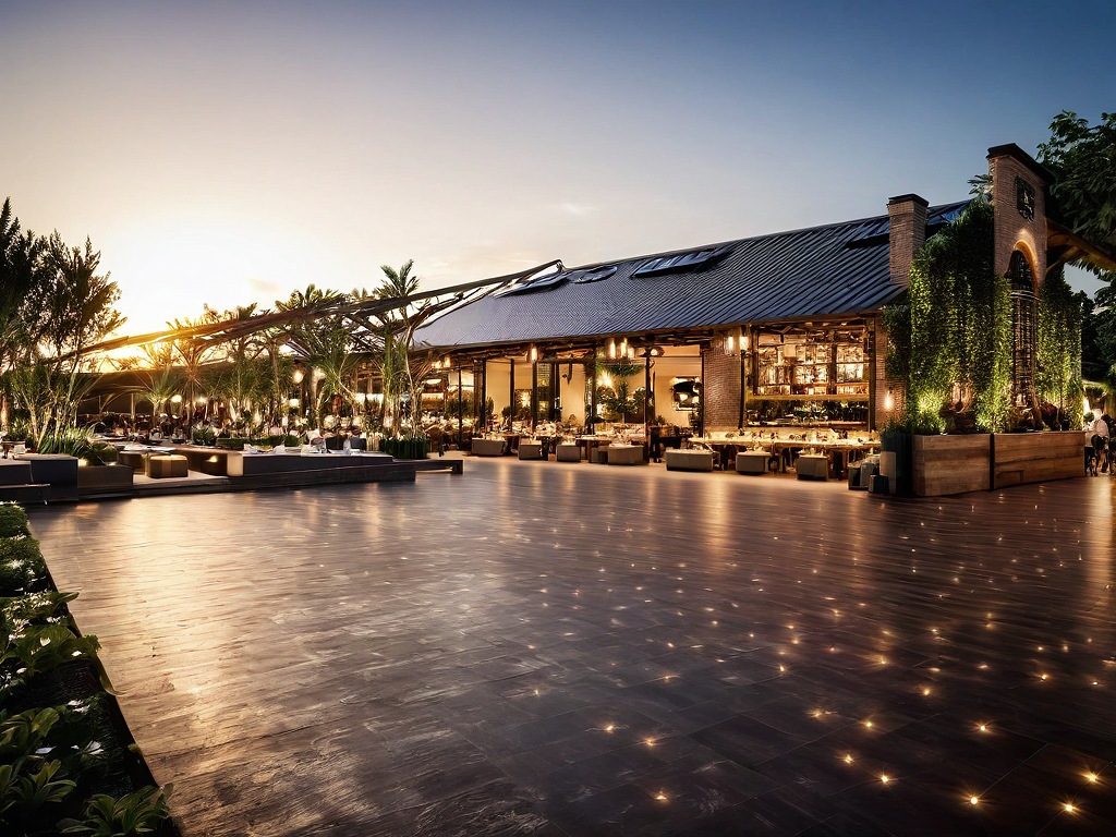 food hall, amazing garden, same construction materials, same facade, amazing terrace, sunset