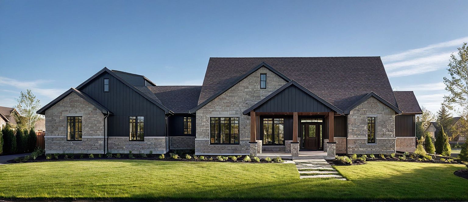 PromptPhoto of a contemporary single-family home featuring a blend of stone and dark wood siding. Emphasize the textured stone facade, large multi-pane windows, and a welcoming front door framed by architectural overhangs. Set in a suburban environment with manicured lawns and adjacent houses. Capture the scene in soft afternoon light, highlighting shadows and reflections in the windows. A low angle perspective with a wide lens to showcase the architectural details and the home's relationship with its surroundings.