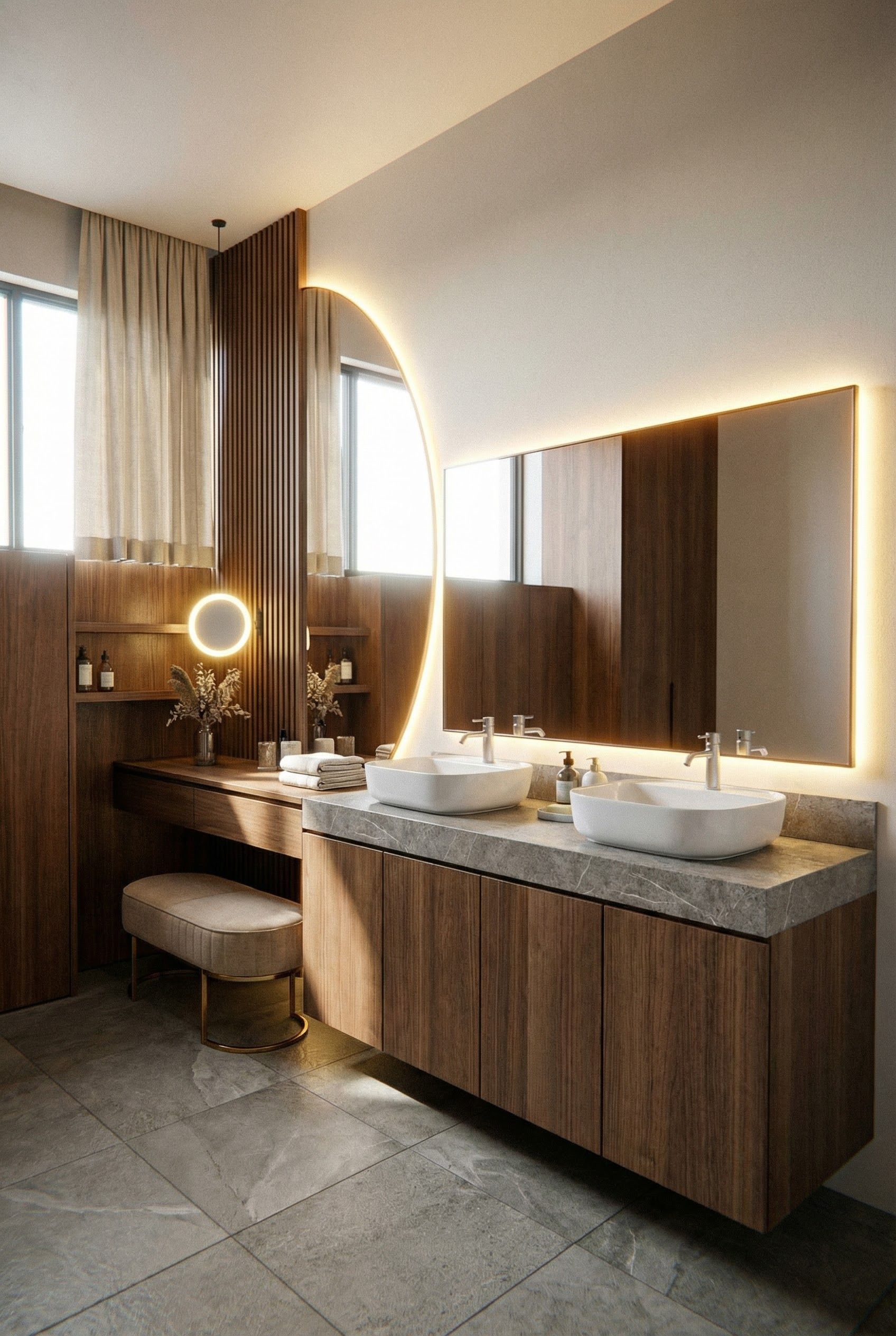 Photo of a modern bathroom interior featuring dual sleek washbasins atop a textured stone countertop, surrounded by rich wooden cabinetry and paneling. Emphasize the combination of natural wood tones and elegant stone textures. The space is illuminated with soft, ambient lighting from a round mirror light fixture. Capture the scene from a corner perspective using a wide-angle lens to enhance depth, showcasing the clean lines and contemporary design elements in an airy, minimalist urban setting.add LED lighting to the edges of the mirrors in a warm light tone, insert a curtain in the side window in a light color, keep exact camera angle