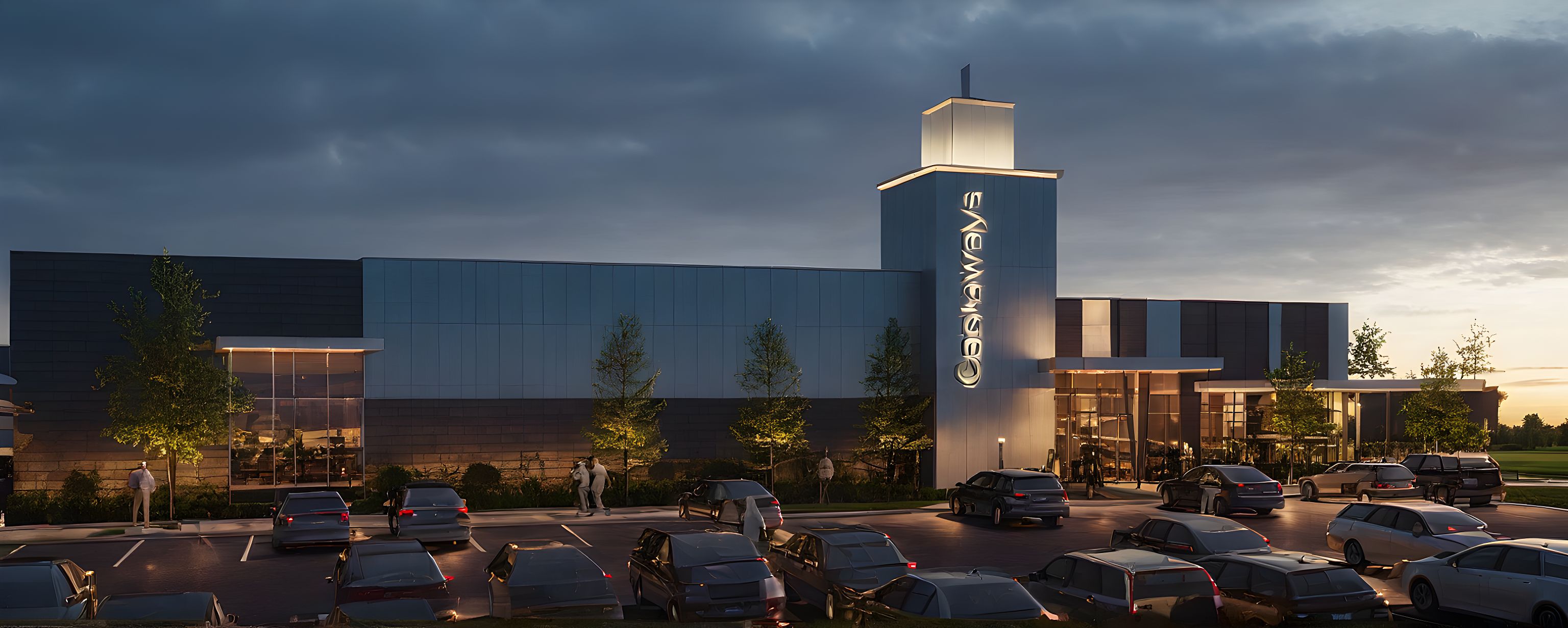 PromptModern commercial building with sundown shot light in windows and golf coarse