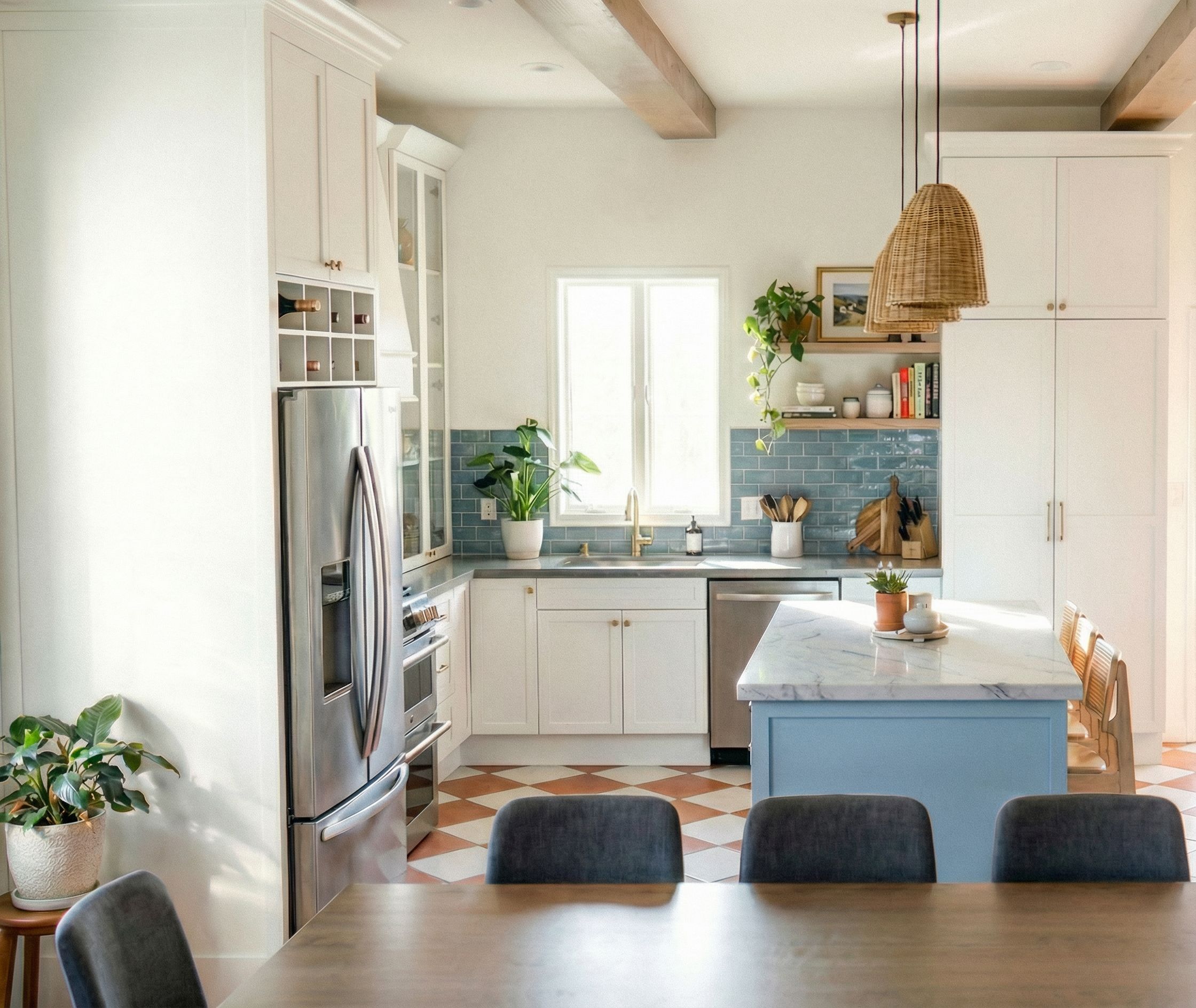 please change the tiled floor to white and terracotta checkered floor, remove the light above the shelf, gold light above the window, keep exact camera angle