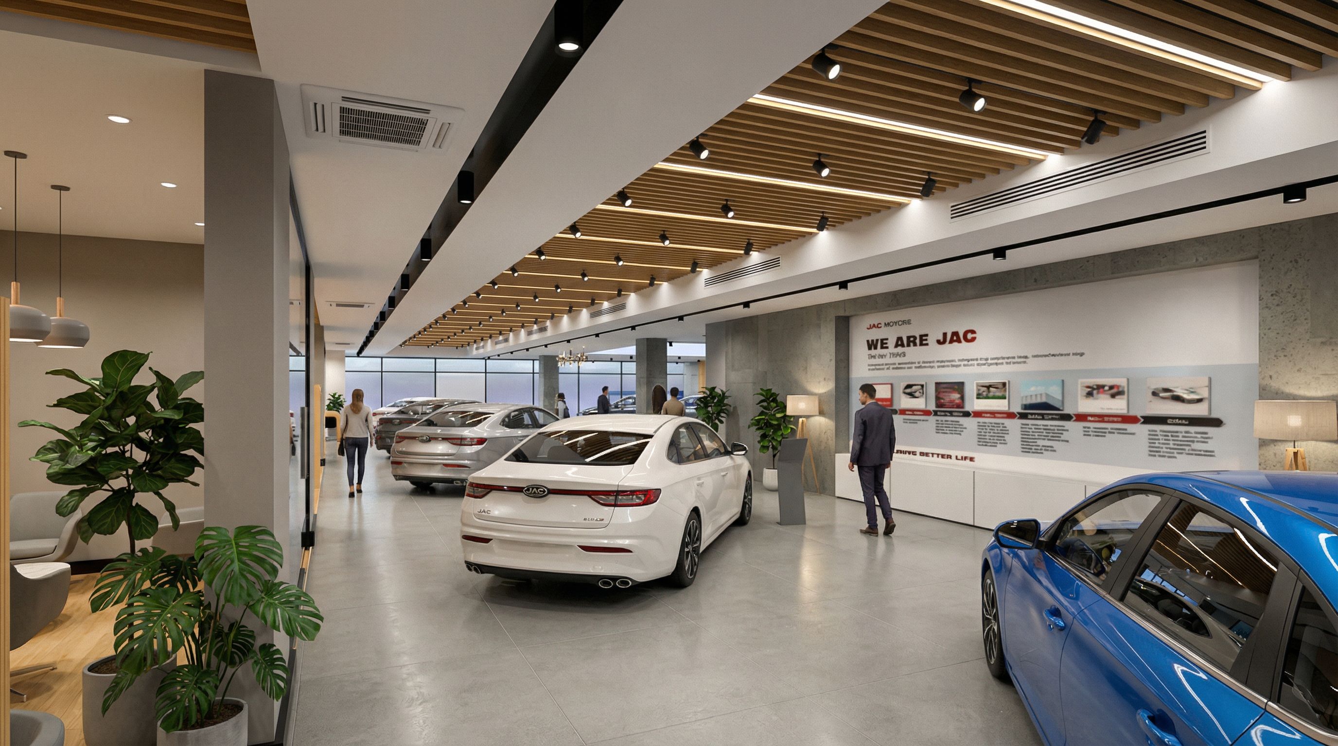 PromptUltra-photorealistic interior render of a modern JAC electric car showroom, strictly maintaining the exact same camera angle, lens position, composition, proportions, depth, and object placement as the reference image. Do NOT crop, rotate, zoom, or alter the perspective in any way.