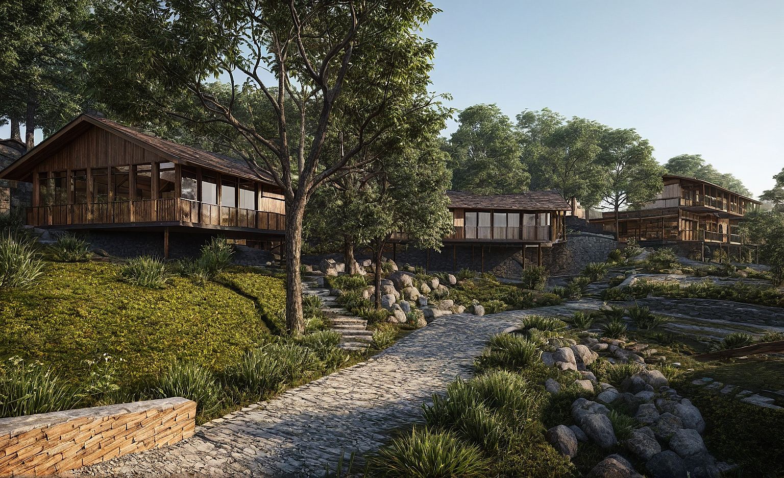 PromptEnhance this mountain resort in Uttarakhand, India, using precise rendering mode. Maintain all existing design elements exactly as shown — no alterations or additions. Apply handcrafted, non-tiled textures to the wooden facades, stone pathways, and shingled roofs. Emphasize natural realism with rich, varied vegetation including Himalayan-native flora, realistic bark on trees, and individual leaf detail. Render soft morning light casting warm highlights and gentle shadows across the scene. Include subtle dew on the plants and damp sheen on stones to evoke a fresh, cozy early morning vibe. Add distant valley haze and a calm, inviting atmosphere that blends built and natural elements seamlessly.