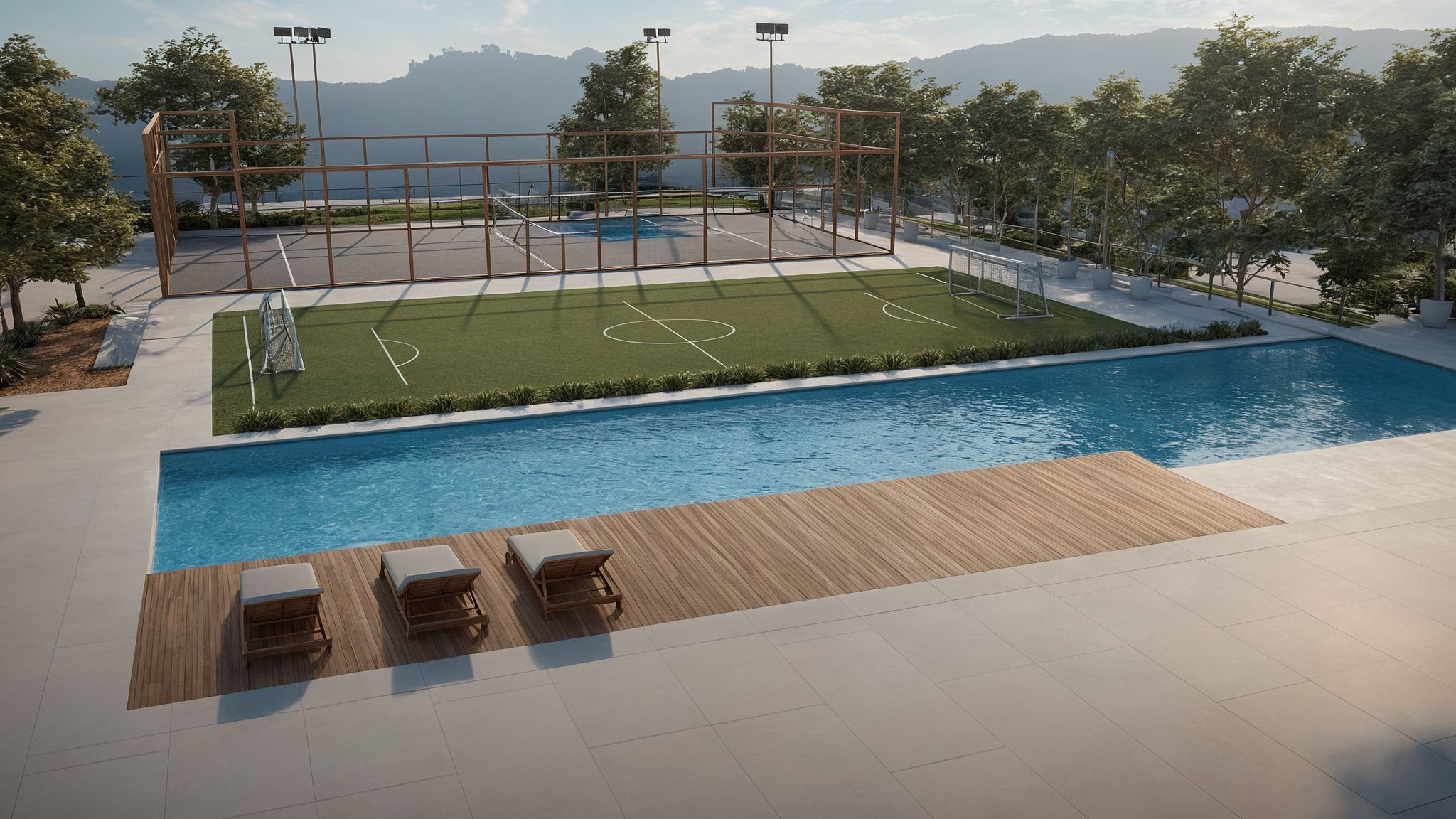 PromptAn incredibly lifelike, richly detailed, photorealistic architectural photograph of the amenities in a residential complex with a pool as primary plane, in the middle of image there is a small soccer field an behind it a Padel court Keep the structural, geometry and architectural design of the image